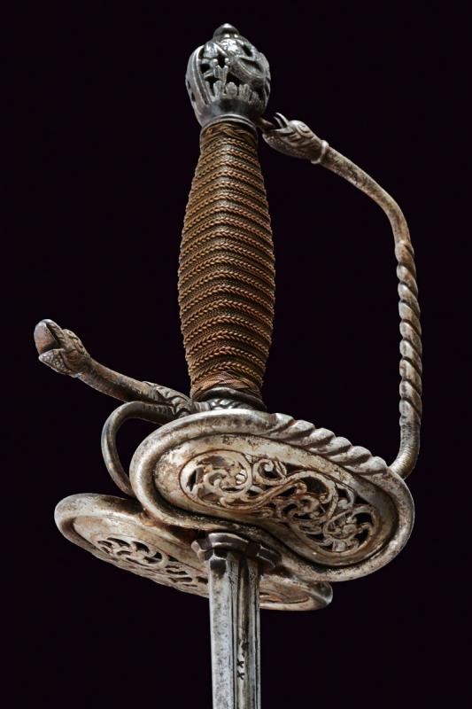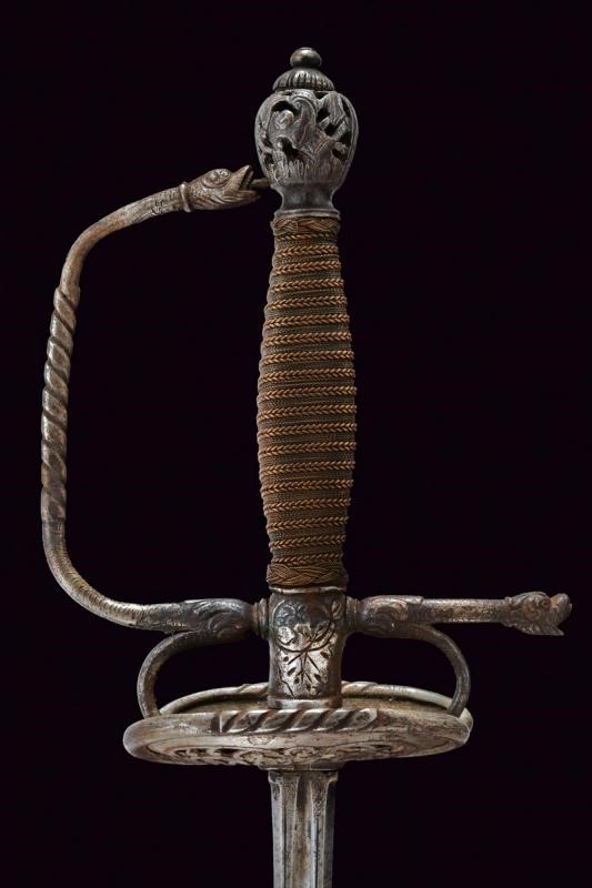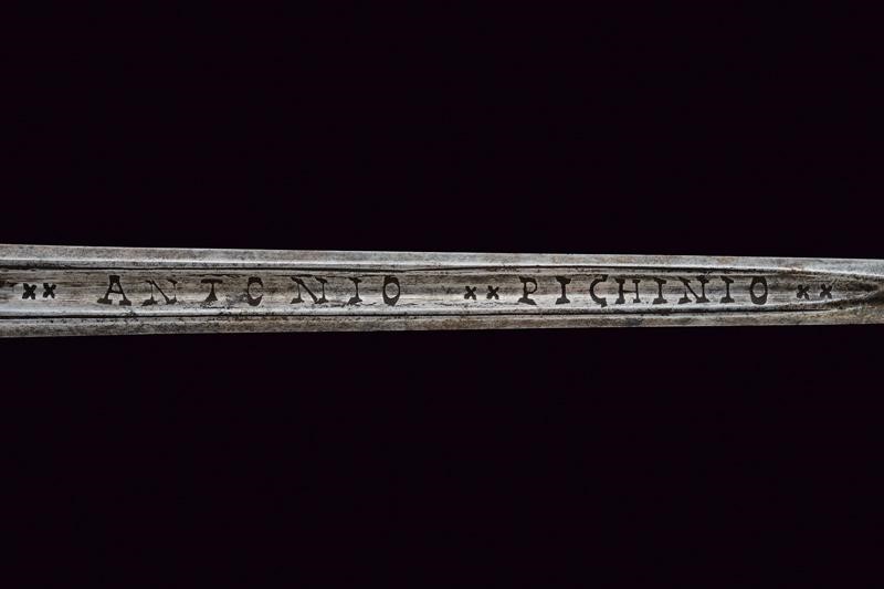 Lama dritta a sezione di losanga, quasi quadra; il forte di sezione esagonale e profondamente sgusciato. All'interno degli sgusci la marcatura "XX ANTONIO XX PICHINIO XX" su entrambe le facce. Con delineatura e una croce al culmine dello sguscio. Il fornimento di proporzioni piuttosto ampie. In ferro. Coccia a due valve traforate a racemi. Il blocchetto di forma quasi cilindrica intagliato a foglie. Guardia con decoro tortile al centro, braccio di parata terminante a testa di mostro. Il pomo ornato a trofei realizzati in rilievo e a traforo. Con un bottone munito di alta basetta. Probabilmente un rimontaggio coevo o poco successivo. Impugnatura con teste di moro in filo d'ottone cosi come le trecciole di rivestimento.