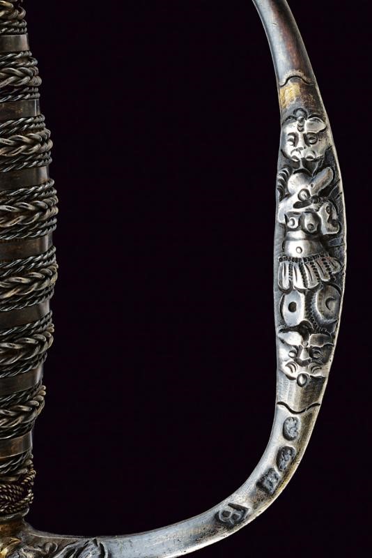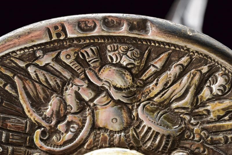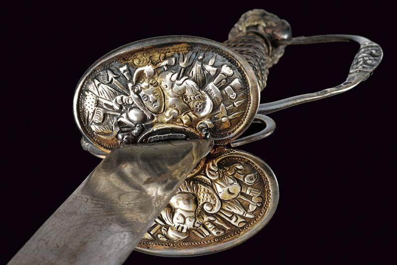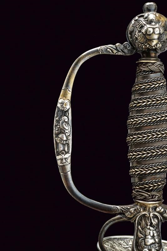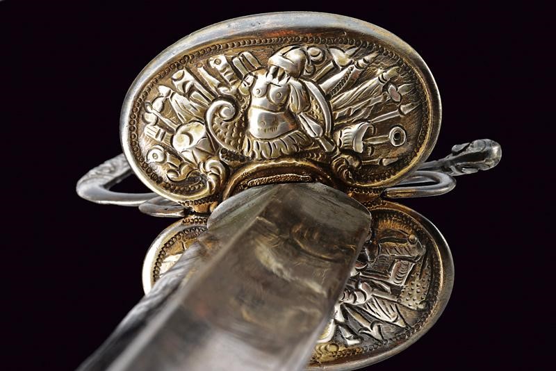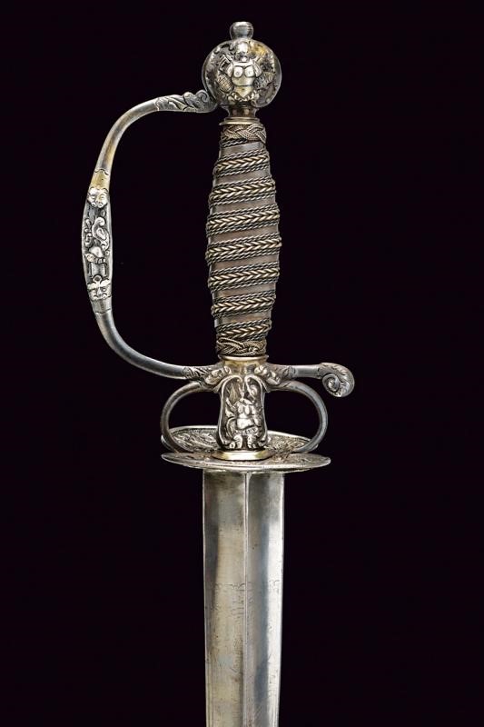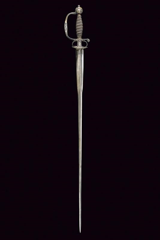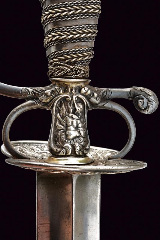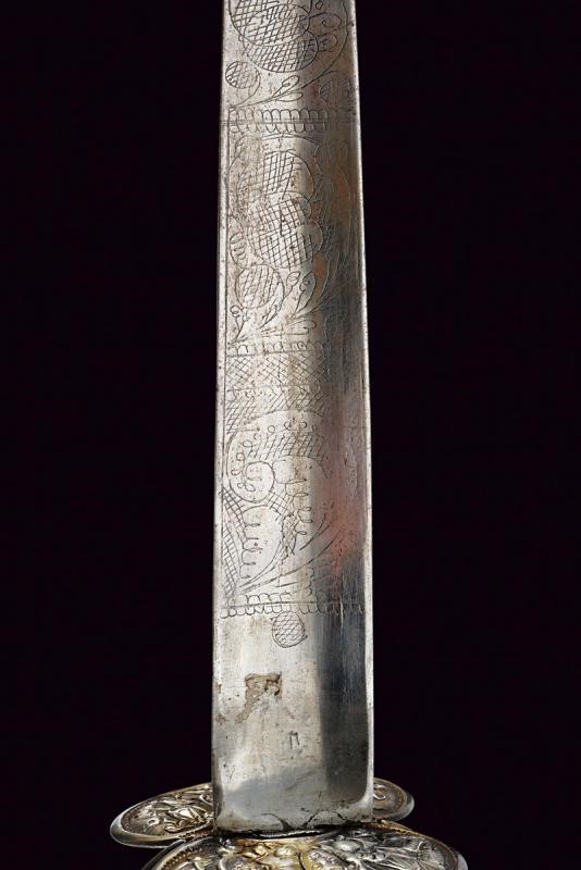 Lama dritta a frantopino, di sezione triangolare a facce incavate, recante al forte resti di incisioni floreali. Fornimento in argento, coccia a due valve ornate a trofei d'armi e armature in bassorilievo; anche il massello con trofei, come la parte centrale della guardia e il pomo, tutti realizzati in bassorilievo. La guardia, come anche la coccia, munita di quattro punzoni, uno dei quali chiaramente leggibile: "B". Impugnatura in legno rivestita con piattina e trecciola d'argento e dotata di teste di moro alle estremità.