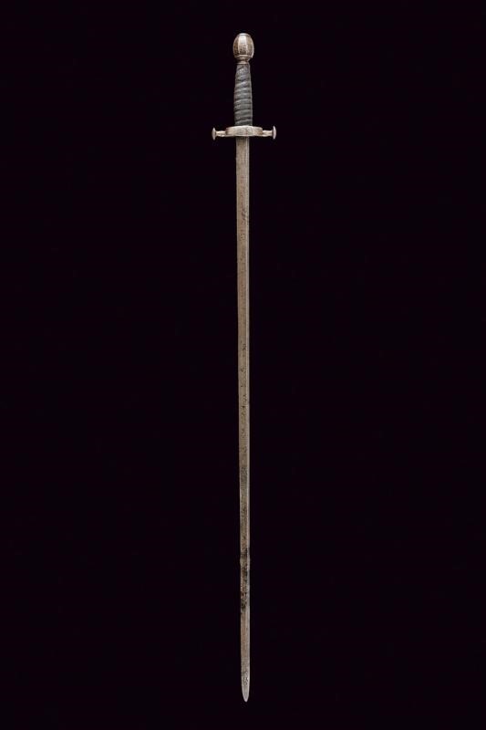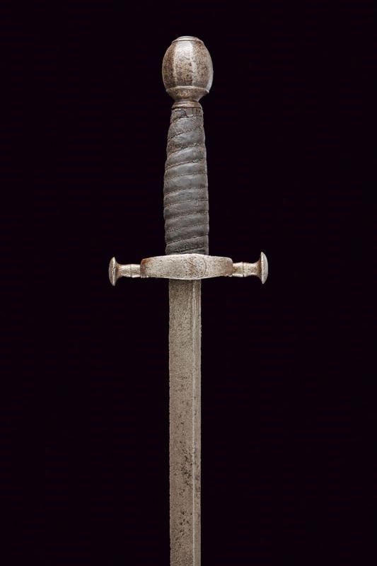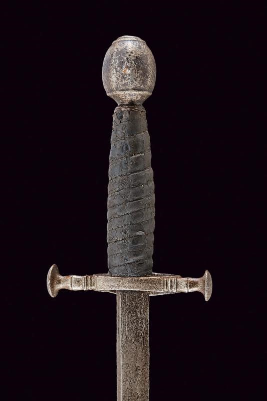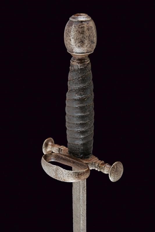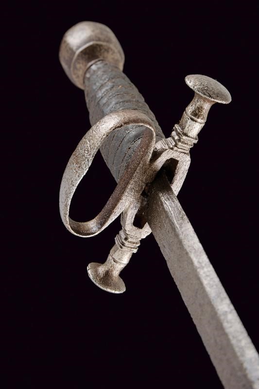 Interessante lama dritta a un filo e controfilo, crescente verso il dorso. Fornimento in ferro con bracci dell'elso dritti, intagliati a balaustro e con estremità a lavorate a grandi bottoni lenticolari. Pomo ovale, faccettato e con calotte leggermente rilevate. Impugnatura in legno, rivestita di cuoio e senza trecciola.