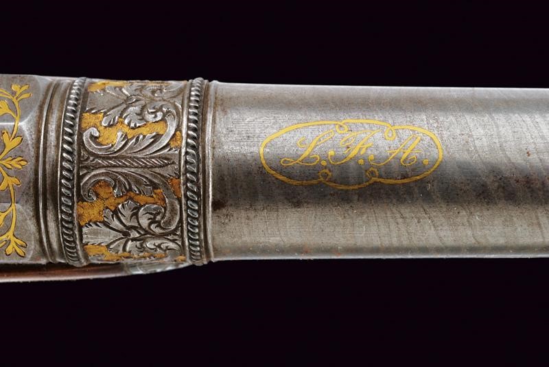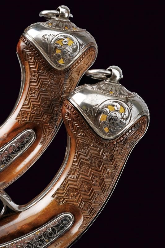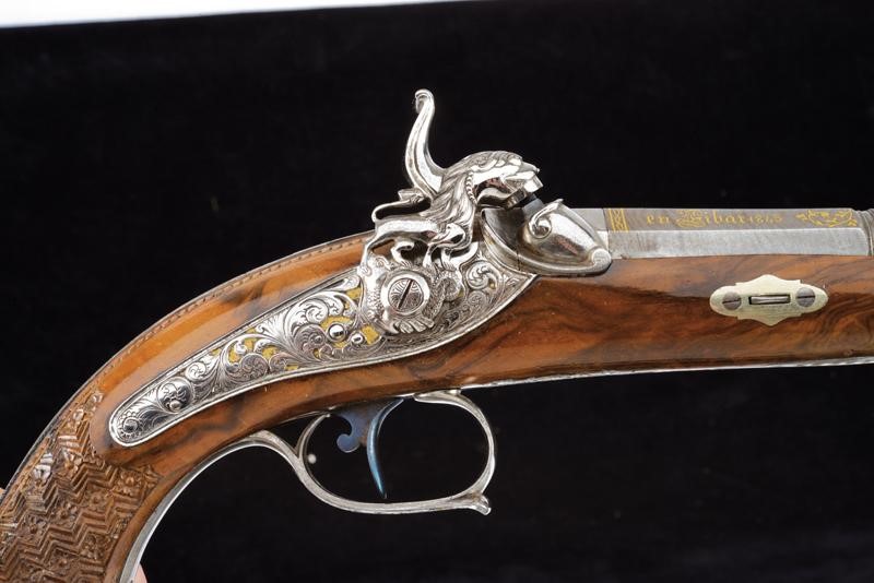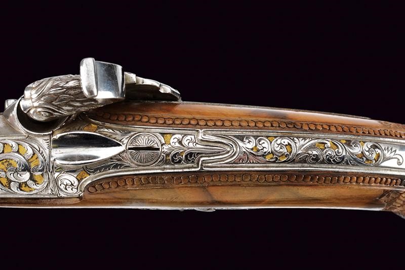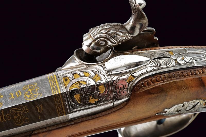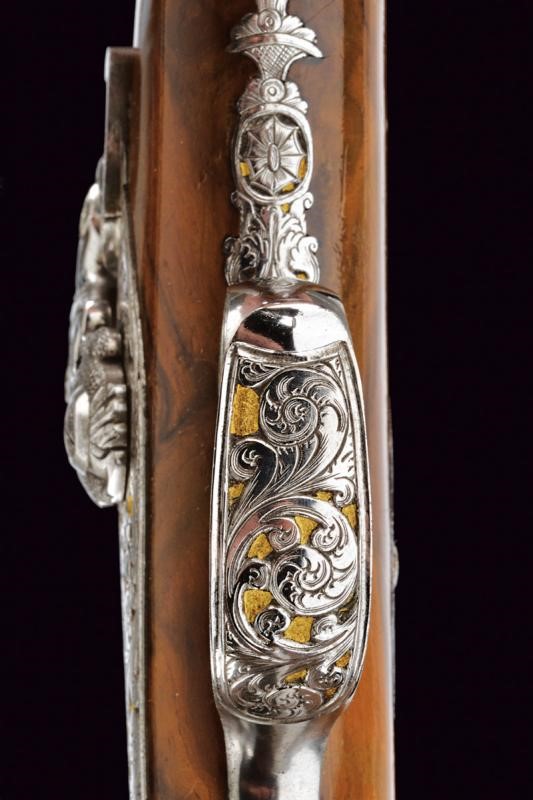 Canne lisce a due ordini, in fine damasco; la prima parte ottagonale e marcata in oro fra decorazioni floreali "à Espiral por Arana en Eibar 1845", la base intagliata a riccioli incisi su fondo dorato, al cambio una banda intagliata a motivi floreali su fondo dorato con cornice ad anelli lavorati a tacche per fingere il tortiglione; la seconda parte tonda recante il monogramma "L.F.A." in oro racchiuso in cartiglio, la volata a cannoncino, decorata con la stessa cornice, cal. 17 mm in volata. Lunghe codette decorate en suite e con traguardo a sella. Batterie a molla indietro finemente incise a fogliame su fondo dorato, i cani intagliati e traforati a effigiare un leone che poggia su un piccolo drago. Casse in radica a tre quarti con calci intagliati a motivi floreali e geometrici, fornimenti in acciaio decorati con gli stessi bellissimi motivi; grilletti bruniti, cocce con anello di sospensione. Bacchette in corno con cavastracci e battipalla in metallo.