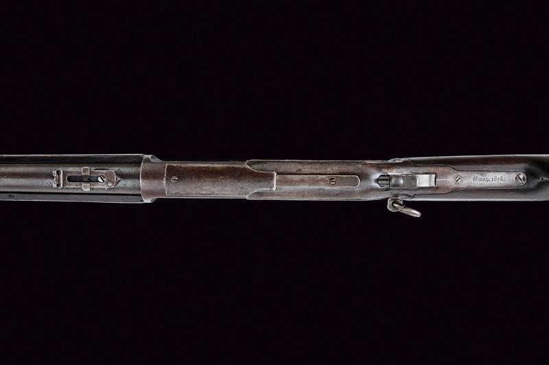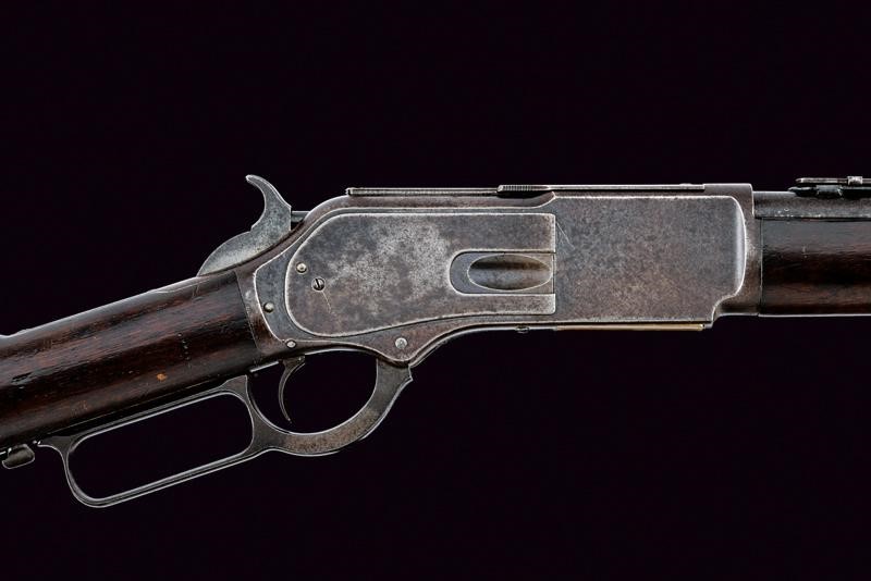 Canna tonda rigata con indirizzo e brevetti, intaccature, alzo variabile e mirino; codetta con dicitura del modello, castello liscio, matricola "241xx", calcio ed astina in legno. Anello da sella sul fianco sinistro. Raro modello ordinato dalla NWMP (The Royal Northwest Mounted Police) canadese dal 1877 al 1885, realizzato complessivamente in 996 pezzi.