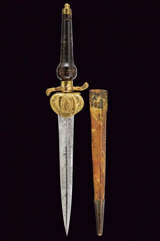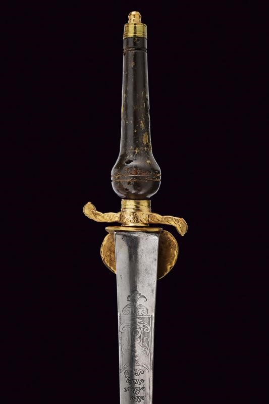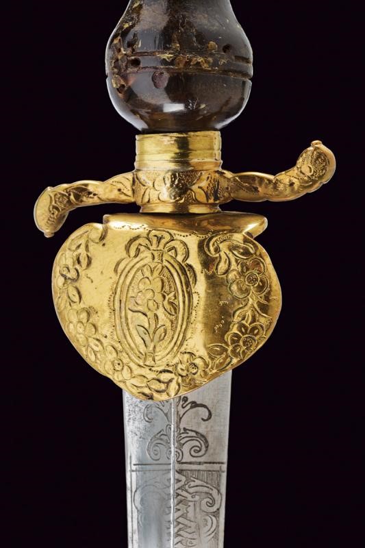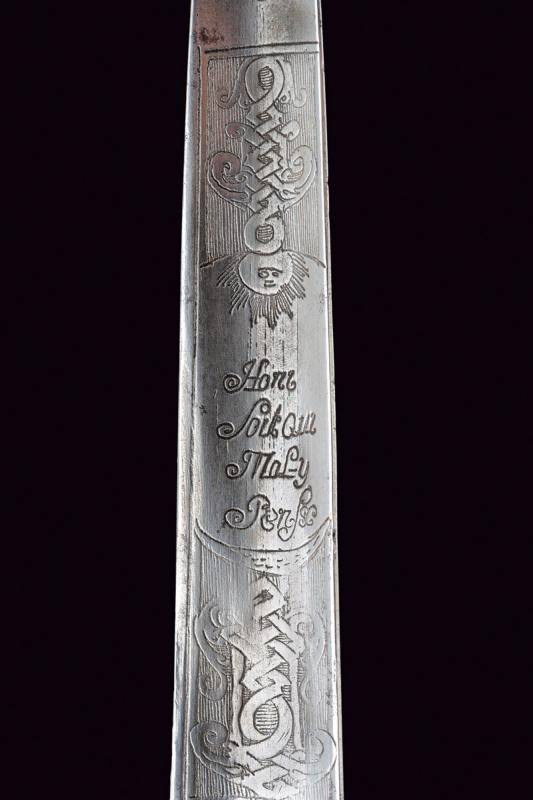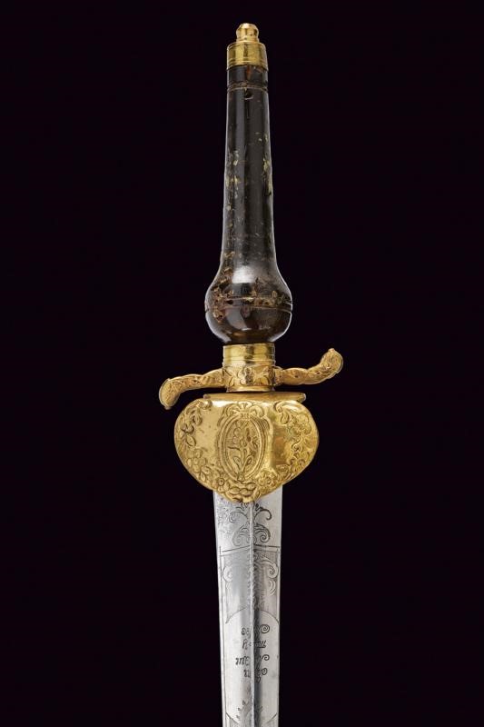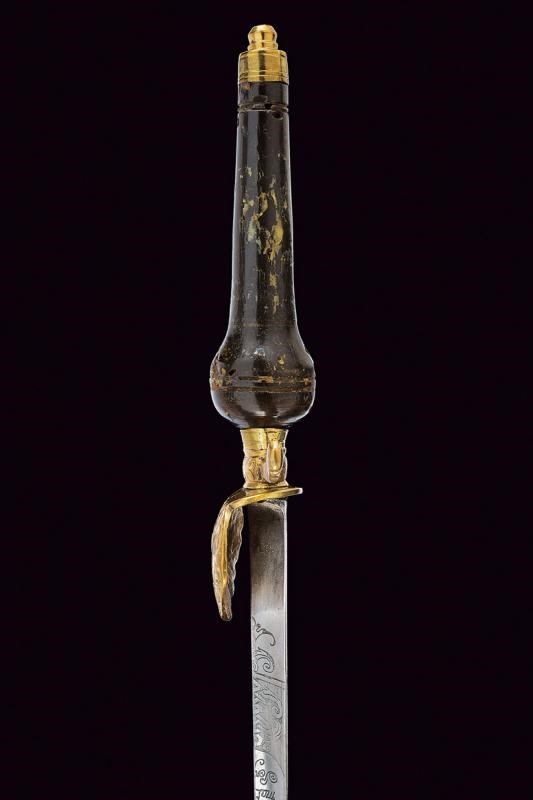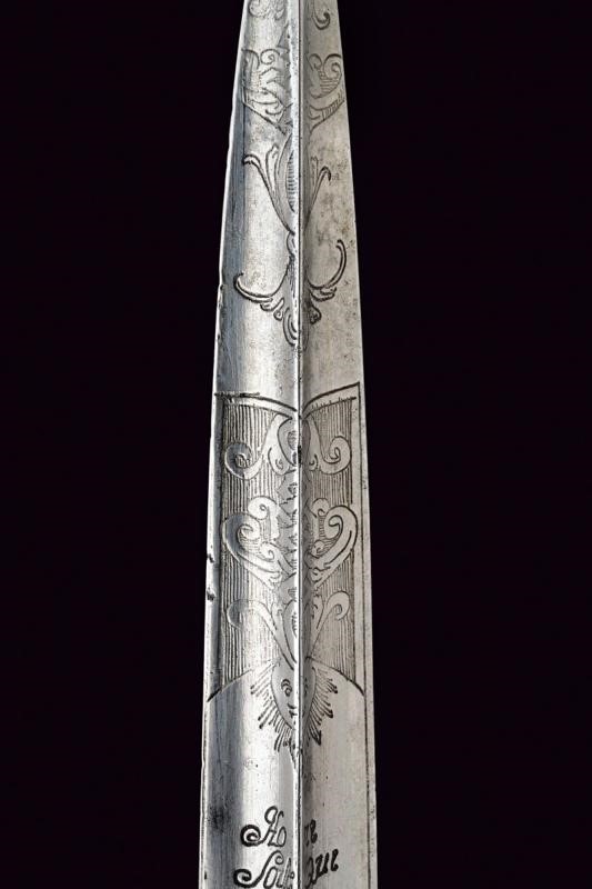La lama triangolare proveniente da uno spadino inglese con marcatura "Honi Soit qui Mal y Pense" sormontata da un sole e posta fra disegni floreali su entrambi i lati. Fornimento in ottone; elso a "S" e pelta incisi a motivi floreali. Impugnatura di forma tipica, in corno (mancanze), con cappellotto in ottone. Fodero in legno con resti di rivestimento, la cappa mancante.