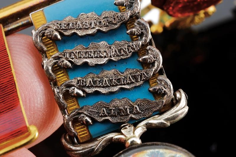 Ordine del Bagno, dorato e smaltato; medaglia "Crimea" con quattro baratte di battaglie; Ordine della Legion d'Onore, (Francia); Ordine di Medjidié (Impero Ottomano). I nastri in metallo smaltato.