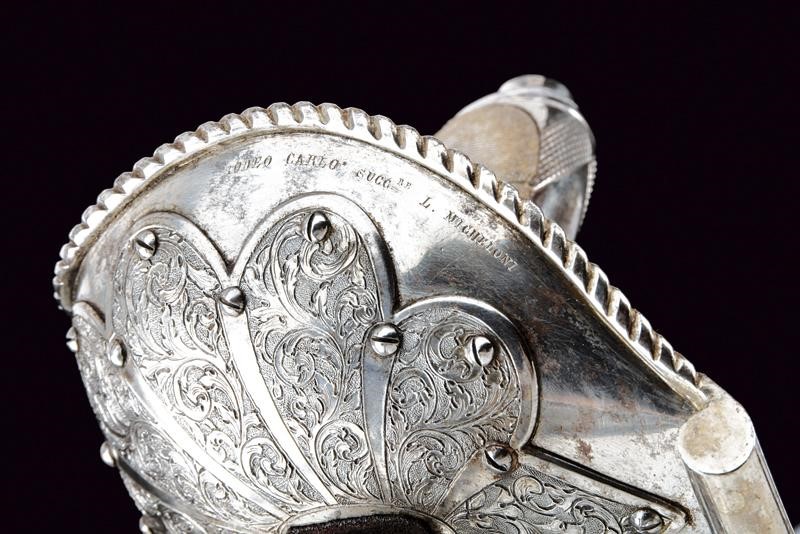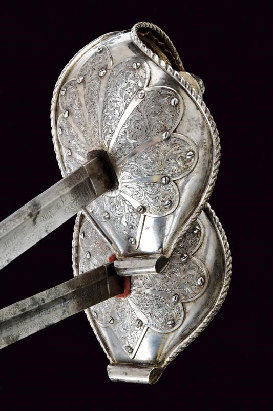 Lame curve a un filo e controfilo con sguscio che diviene duplice al debole, recanti su un lato al forte l'iscrizione "NON TI FIDAR DI ME SE IL COR TI MANCA" e sull'altro il motto "IL COR DEL CALABRESE E' COR D'ACCIAIO", entrambi i motti fra incisioni a motivi floreali. I talloni marcati con corona, "M" e con due altri punzoni poco visibili. Bei fornimenti con ampia guardia in ferro con bordo rialzato e lavorato a fingere il tortiglione; la superficie esterna rinforzata da una placca intagliata a fiore incisa a racemi e fissata con una serie di viti; su un lato incisione "BODEO CARLO SUCC.RE L. MICHELONI" e dalla parte opposta "FABB.TE D'ARMI BRESCIA-NAPOLI". L'interno del fornimento rivestito di velluto bordeaux (danni d'uso e del tempo) con banda in canutiglia dorata. Impugnature in pelle di pesce a settori suddivisi da filo metallico. Capette lunghe. Foderi in legno rivestiti di velluto bordeaux e con fornimenti in ferro; cappa munita di campanella e puntale incisi a motivi floreali.