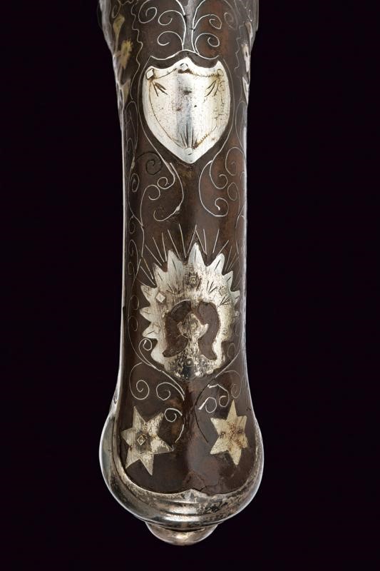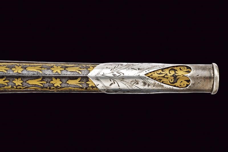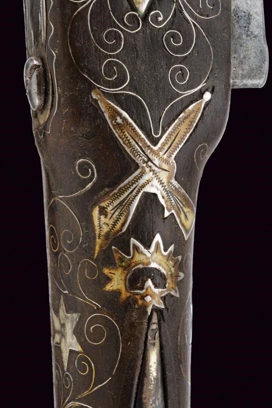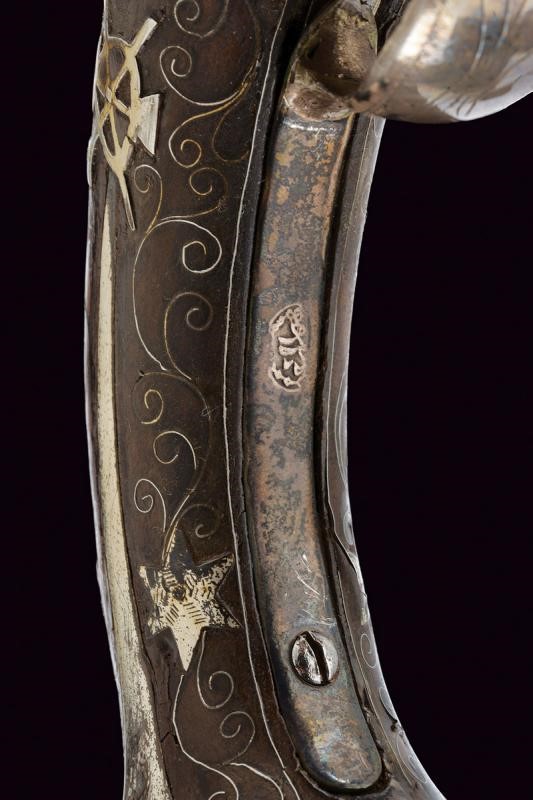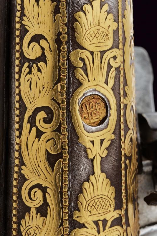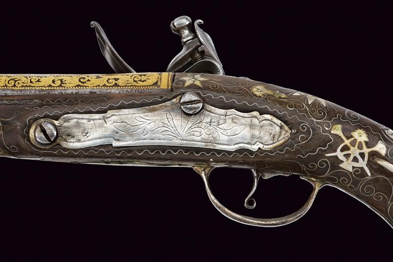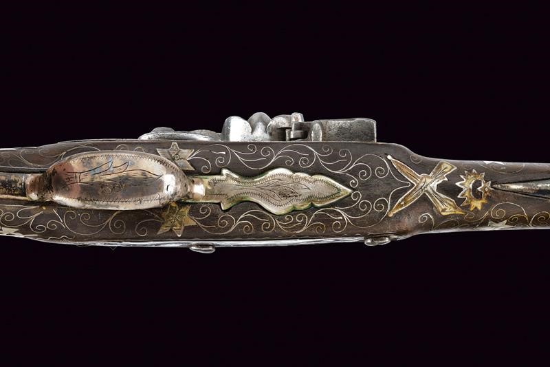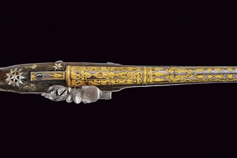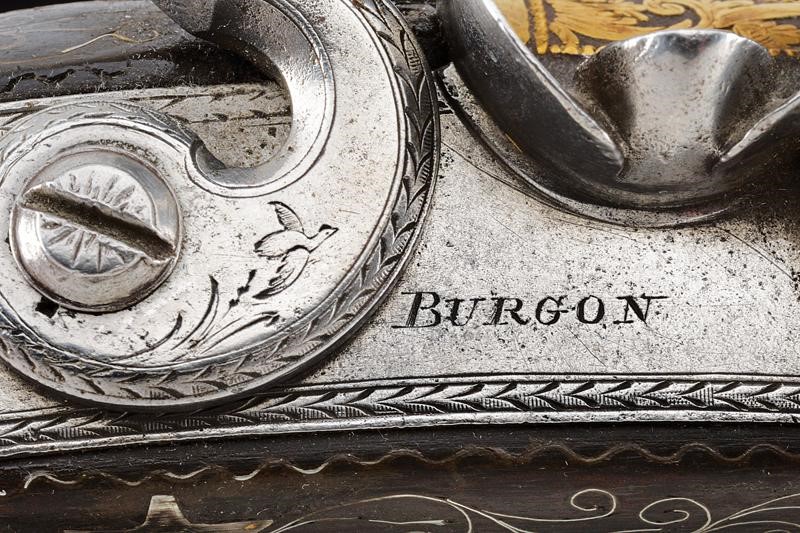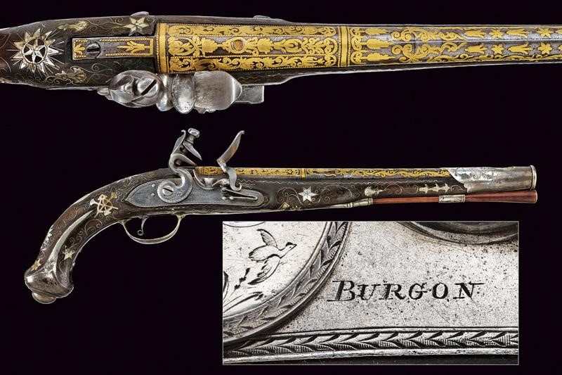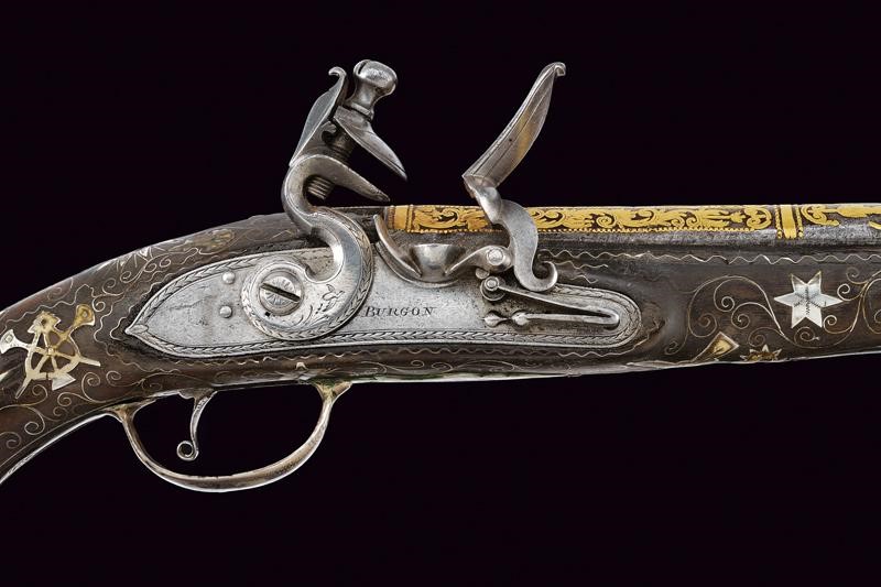 Canna liscia a due ordini, prima ottagonale, con punzone arabo rimesso in oro, poi tonda con sottile nervatura; su tutta la lunghezza bellissime decorazioni floreali rimesse in oro, cal. 15 mm. Codetta decorata en suite. Batteria firmata "BURGON", incisa a motivi floreali e con un volatile, munita di sistema antifrizione e a tenuta stagna. Cassa intera in legno riccamente decorata in argento con tarsie a placche e in filigrana. Fornimenti in argento con punzoni arabi. Reggicanna in argento inciso e traforato a cuore. Bacchetta in legno con battipalla in argento.