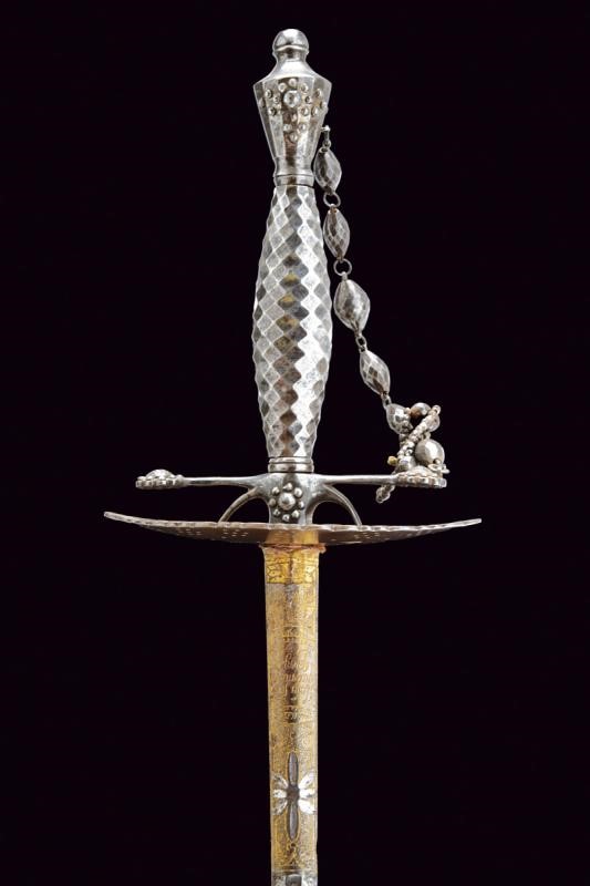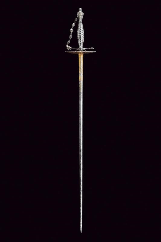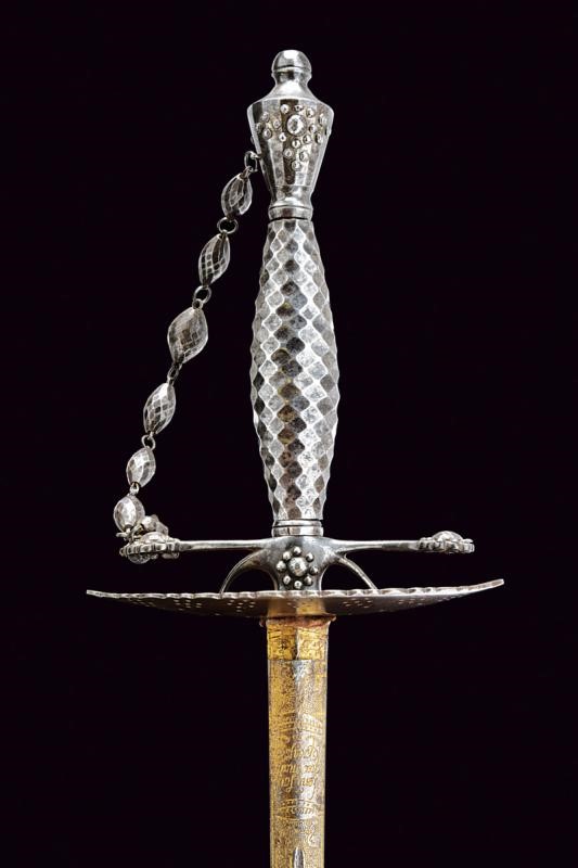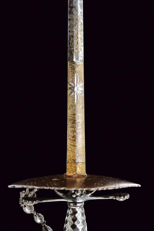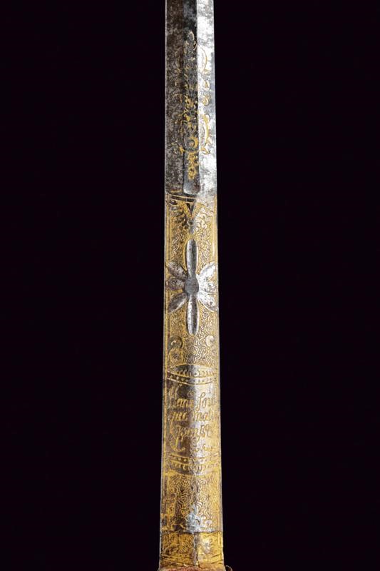 Lama dritta a due fili di sezione esagonale, incisa e dorata al forte a motivi floreali e geometrici con motto "Honi soit chi mal y pense". Fornimento in acciaio massiccio con valva ellittica traforata, elso e pomo decorati con perline d'acciaio, impugnatura decorata a losanga e completa di catenina.