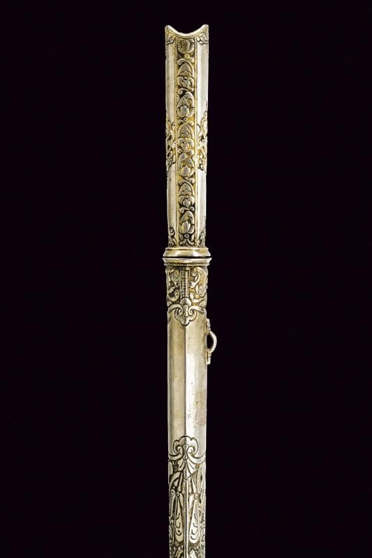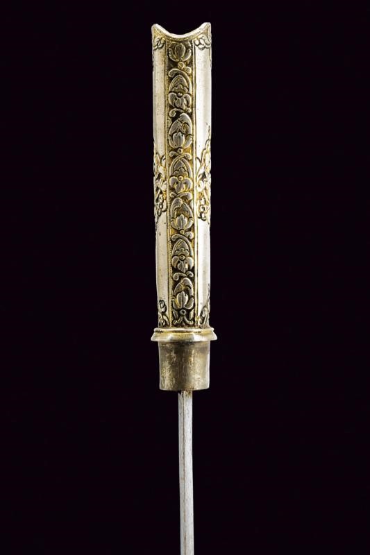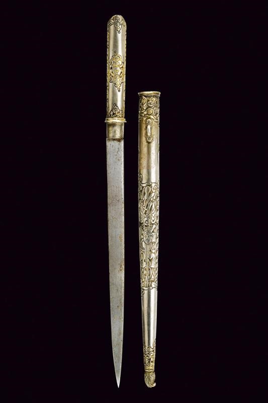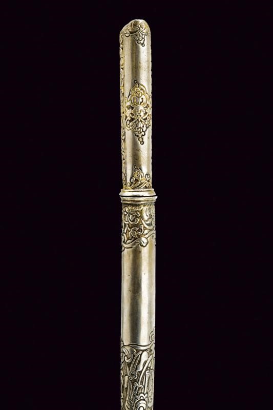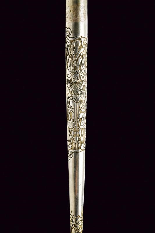 Lunga lama piatta, dritta, a un filo. Impugnatura rivestita completamente con lamina d'argento, finemente incisa con mascheroni e a motivi floreali, con resti di doratura, pomo con piccole orecchie. Fodero in argento decorato en suite e con anello di sospensione.