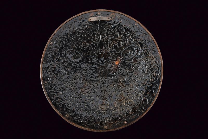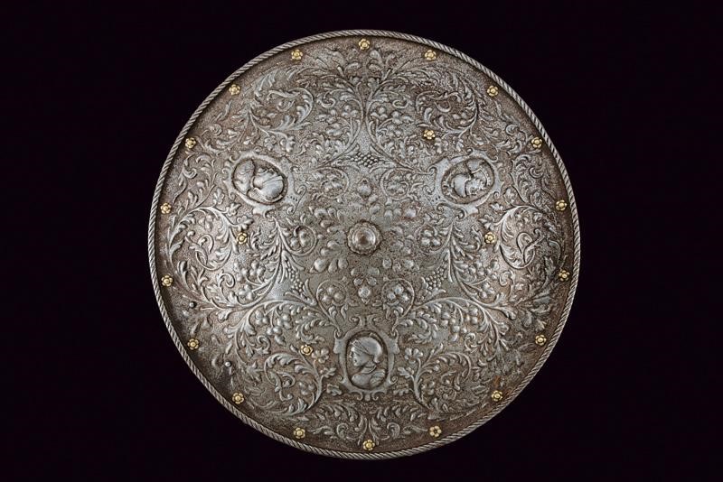 In ferro, di forma circolare convessa. Al centro cuspide su rosetta, la superficie decorata con tre medaglioni recanti busti di guerrieri all'antica circondati da decori floreali. Il margine con giro di rivetti in ottone, bordo rialzato e lavorato a fingere il tortiglione.