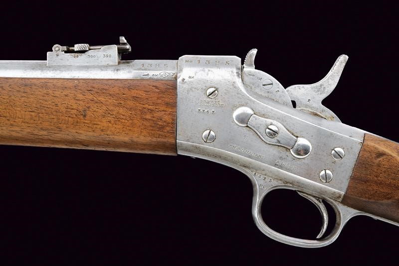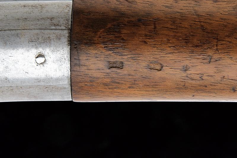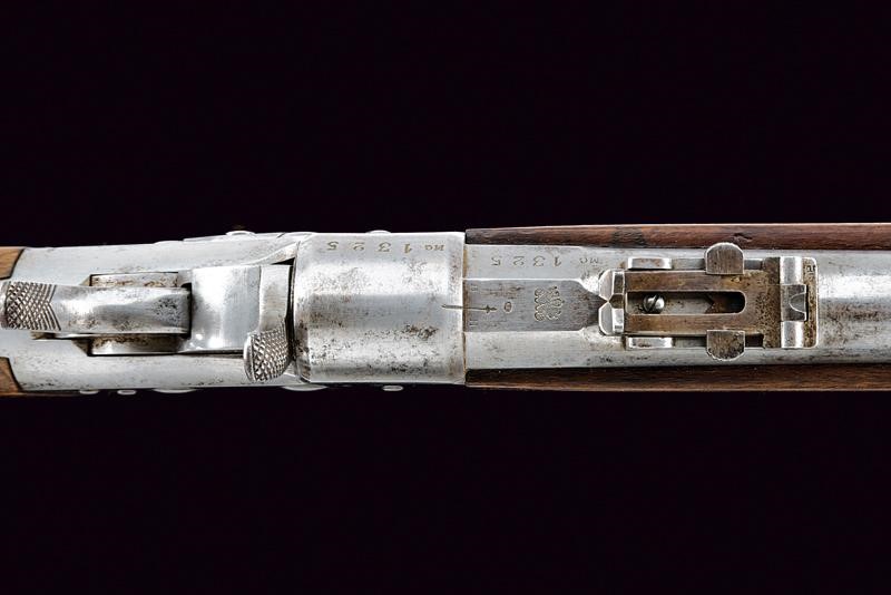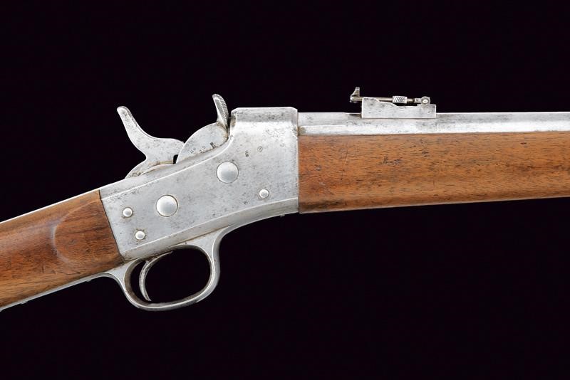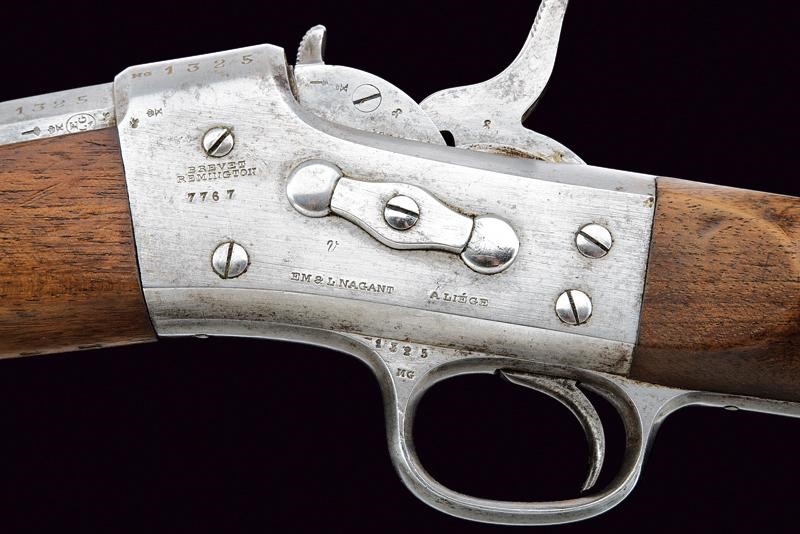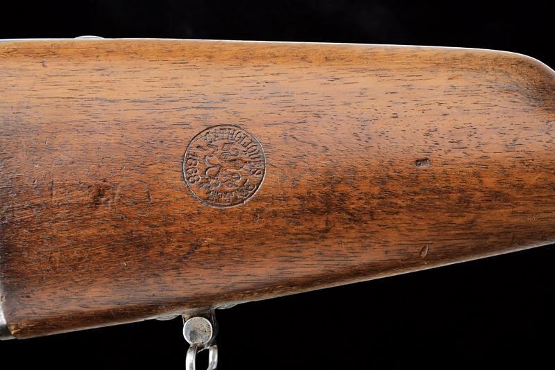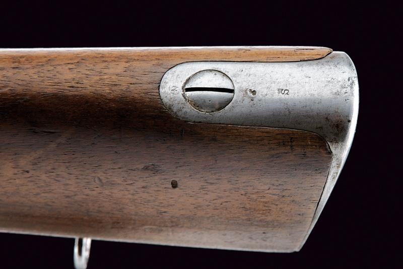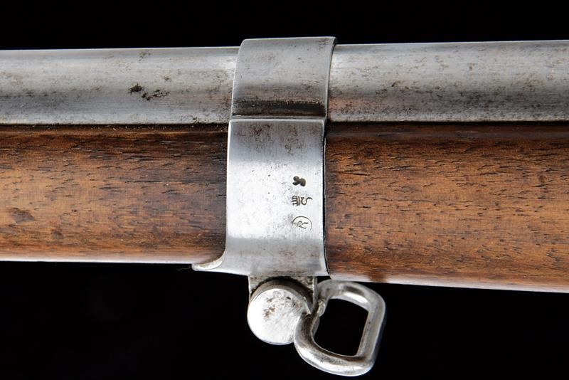 Canna tonda rigata (anima leggermente impolverata con rigatura visibile) con base ottagonale marcata con punzone pontificio, punzone del banco di prova di Liegi, matricola "13xx" e con altri punzoni, dotata di mirino, alzo abbattibile e regolabile, cal. 12 mm. Castello in ferro con marcature "BREVET REMINGTON" e "E. M. & L. NAGANT A LIEGE", punzone "X" sotto corona, "MG" e vari altri punzoni, matricola "13xx". Otturatore a blocco rotante recante punzoni e numero di serie coevo alla canna. Meccanica funzionante. Calcio ed astina in legno, ben visibile sul lato destro della pala il timbro "CATHOLIQUES BELGES" con data "1868". Fornimenti e bacchetta in ferro.