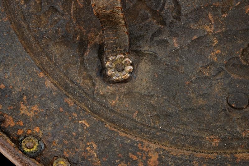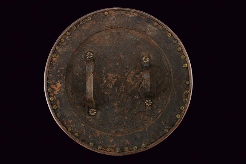 In ferro, di forma circolare e convesso, con bordo rilevato e lavorato a fingere il tortiglione. Maestosamente sbalzato ed inciso in rilievo con una scena di battaglia in primo piano con guerrieri a cavallo ai piedi di una collina, questa sormontata da una roccaforte, nel cielo il sole e le nuvole. Bella esecuzione di armi ed armature. Il bordo ribassato e completamente decorato con ghirlande e motivi floreali. Giro di ribattini con resti di coietti sul retro. Il lato posteriore con due maniglie in cuoio fissate con rosette in ottone.