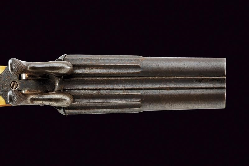 Canne rigate a due ordini, basculanti, ornate a sgusci longitudinali nella prima metà, poi cilindriche, cal. 11 mm. Anima da pulire, rigatura visibile. Castello di tipo boxlock con due cani dorsali e grilletti a scomparsa. Meccaniche ben funzionanti. Leva di sblocco nella parte inferiore. Incisioni a racemi su fondo a trattini. Impugnatura con guancette in avorio. Brunitura color blu, lievi segni d'ossidazione. Nella sua custodia antica sagomata, con struttura rigida rivestita esternamente in marocchino bruno (segni d'uso e del tempo) con iscrizione a impressioni dorate "SOUVENIR".