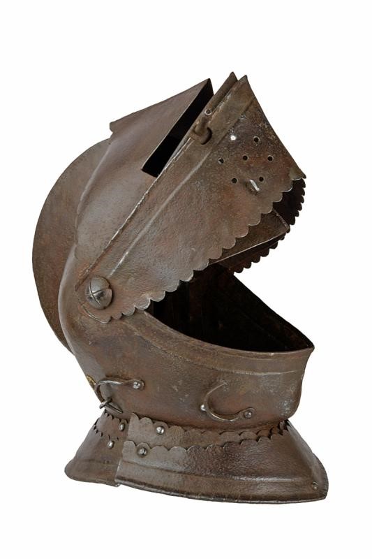Leggero coppo liscio con cresta medio-alta lavorata a fingere il tortiglione, vista appuntita con larga fessura oculare, ventaglia costolata in mezzeria con fori di areazione. Barbozza, due lame di guardacollo e due di gronda. I bordi di tutti gli elementi, a parte il coppo, ondulati. Visiera con perno di apertura, barbozza e ventaglia con gancio di chiusura.