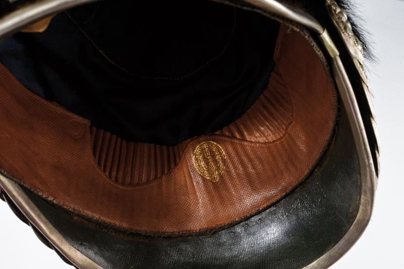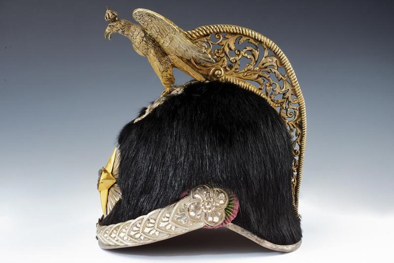 Coppo rivestito di pelliccia nera di foca vitulina, cimiero dorato messo a giorno su una base in argento sbalzata a fiorame recante i bolli dell'argentiere, aquila coronata in argento a tutto tondo. Raggiera in argento con piccola stella centrale dorata caricata con il tipico monogramma VE coronato (Re Vittorio Emanuele II, 1861-1878). Sottogola in argento a squame con rosoni lobati e coccarda tricolore in filo d'argento. Bell' interno con visiere in marocchino verde, alluda in cuoio marrone in parte plissettato recante impresso in oro il marchio del fabbricante londinese. Cuffie in seta blu. Pennacchio originale completo di pennacchiera dorata.