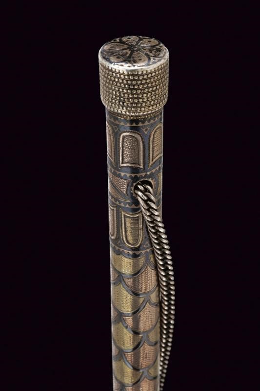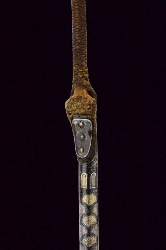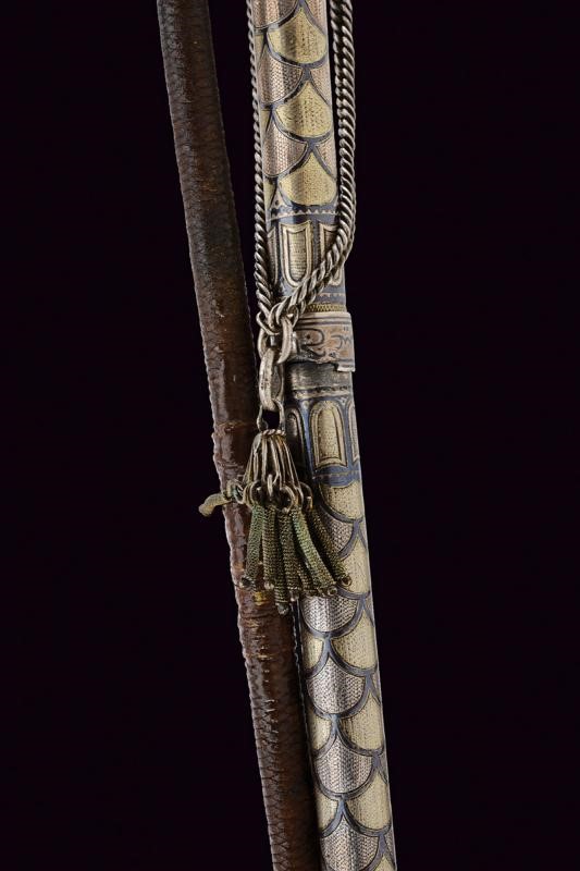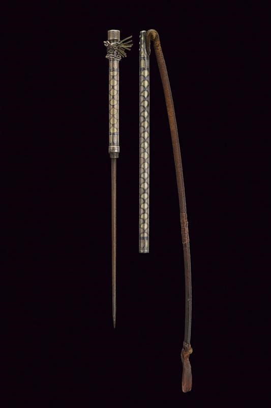 Sottile lama di sezione triangolare. Impugnatura cilindrica rivestita completamente con lamina d'argento decorata a incisioni geometriche e munita di catenina. La ghiera di chiusura recante iscrizione in caratteri araba (con piccola mancanza). Il fodero sempre cilindrico e decorato en suite. Al puntale del fodero è montato un frustino da cavallo in cuoio (restauro). Raro.