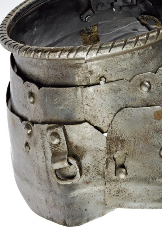 Entrambi i padiglioni a tre lame, quelle superiori con spesso cordone lavorato a tortiglione. Fibbie e coietti di epoca successiva. Piccolo restauro.