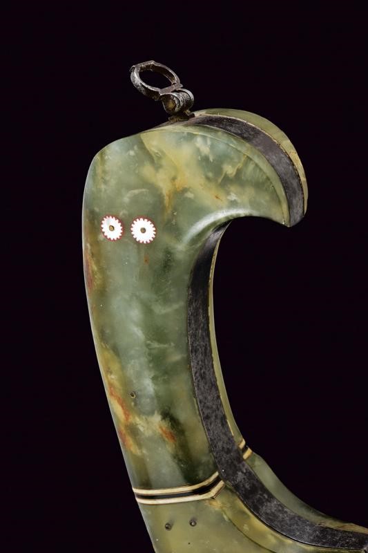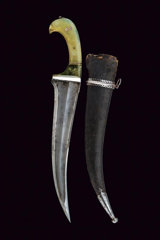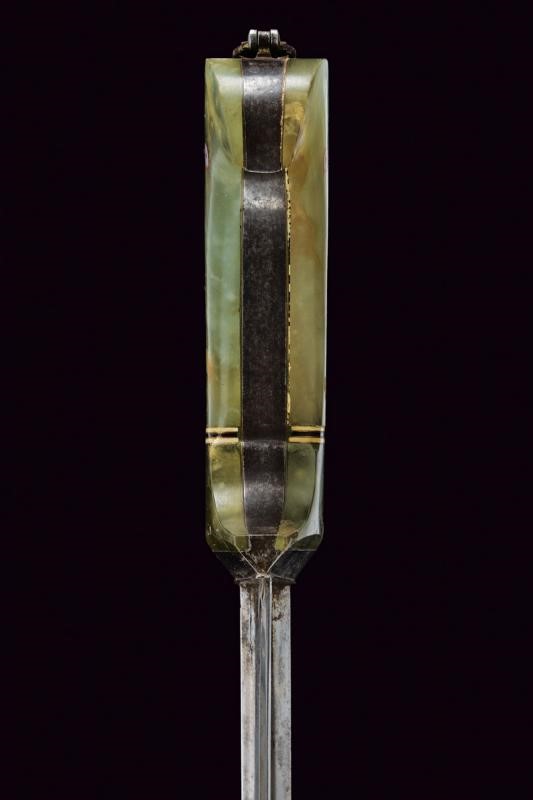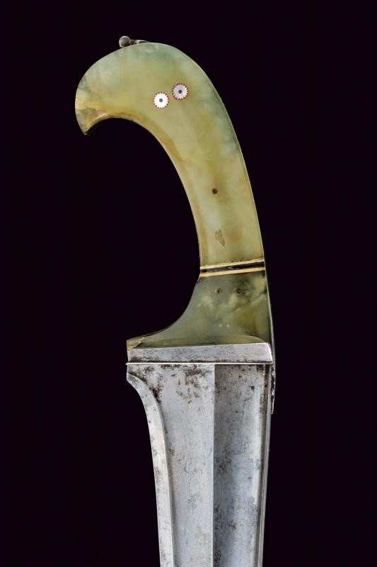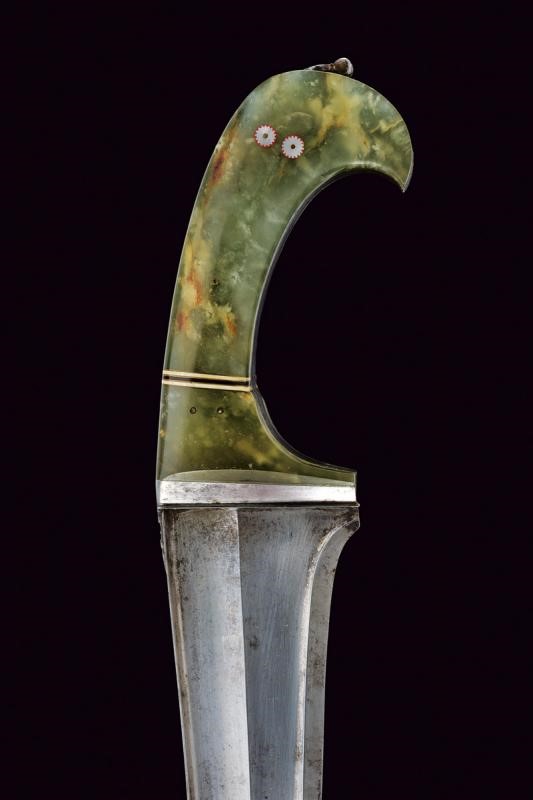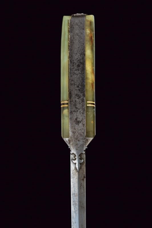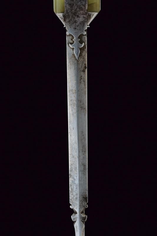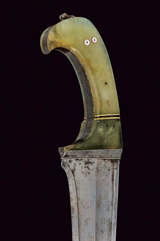 Larga e robusta lama curva a un filo e controfilo con punta rinforzata e costolata (in damasco?), con dorso a "T". Impugnatura in ferro con giglio alla base del dorso, cornice liscia e guancette in pietra verde decorate con bande bianconere in corno e stelle in madreperla, sul pomo un anello di sospensione mobile. Fodero in legno ricoperto di cuoio (piccole mancanze) con fascia traforata e puntale decorato con un giglio in ferro.