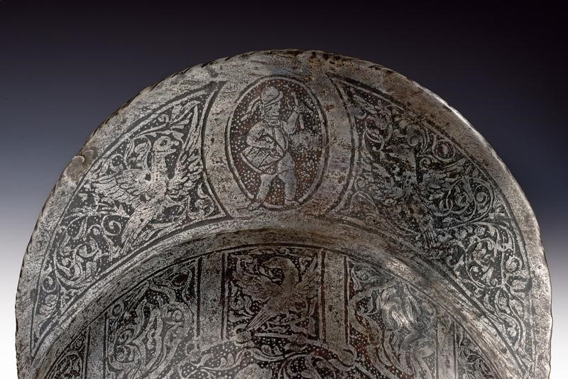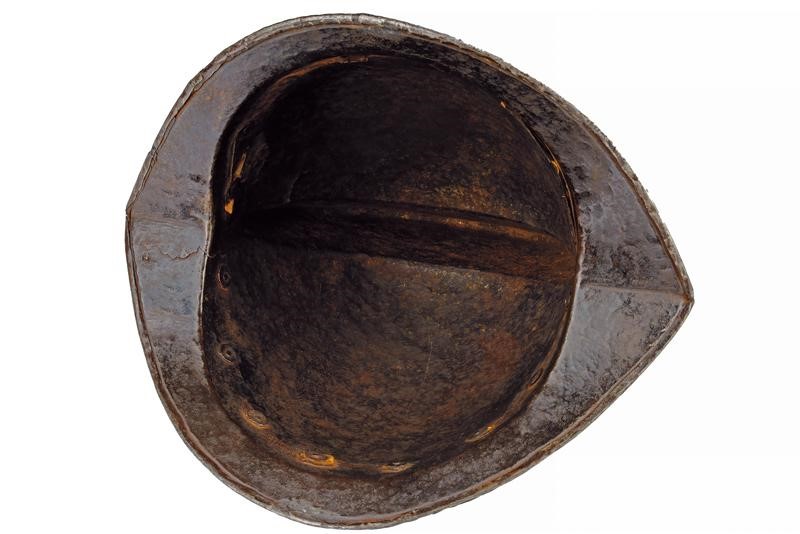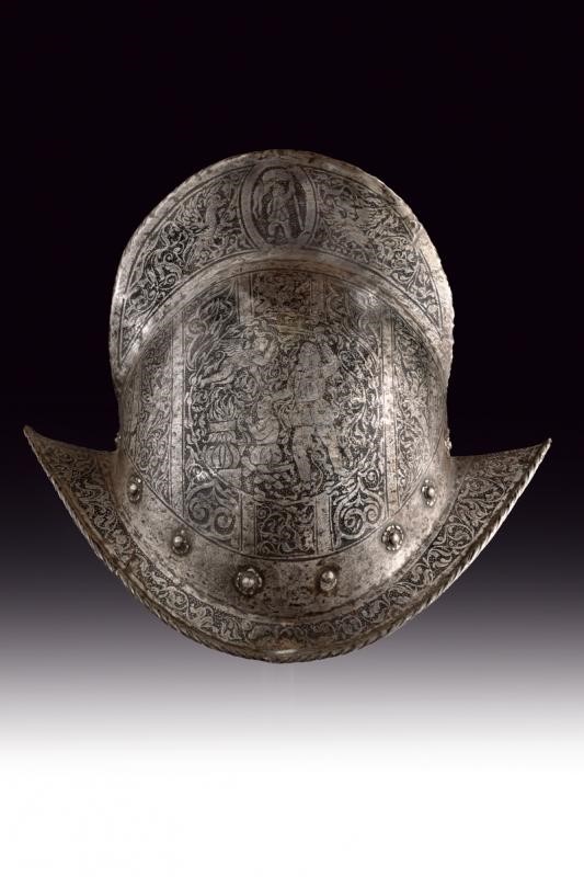 Coppo in ferro lavorato in un solo pezzo con la tesa. Al sommo con cresta di media altezza con bordo lavorato a fingere il tortiglione, la tesa spiovente appuntita e costolata con margine orlato e anch'esso lavorato a fingere il tortiglione. Tutta la superficie finemente incisa; su un lato raffigurazione della scena biblica del "Sacrificio di Isacco" entro una cornice circolare circondata da effigi di volatili e disegni floreali su fondo granulato, sull'altro lato ritratto un lanciere a cavallo decorato en suite. La cresta con raffigurazione di un tamburino e di un alfiere, entrambi entro un ellisse posta fra effigi di uccelli. La tesa ornata a motivi floreali. Base con giro di rivetti muniti di rosetta in ferro (piccole mancanze). All'interno sfogliature e resti di coietti.