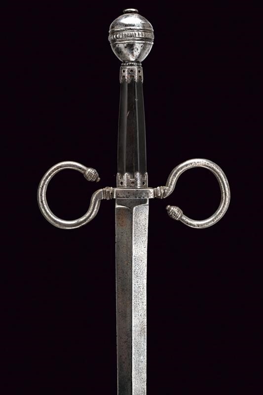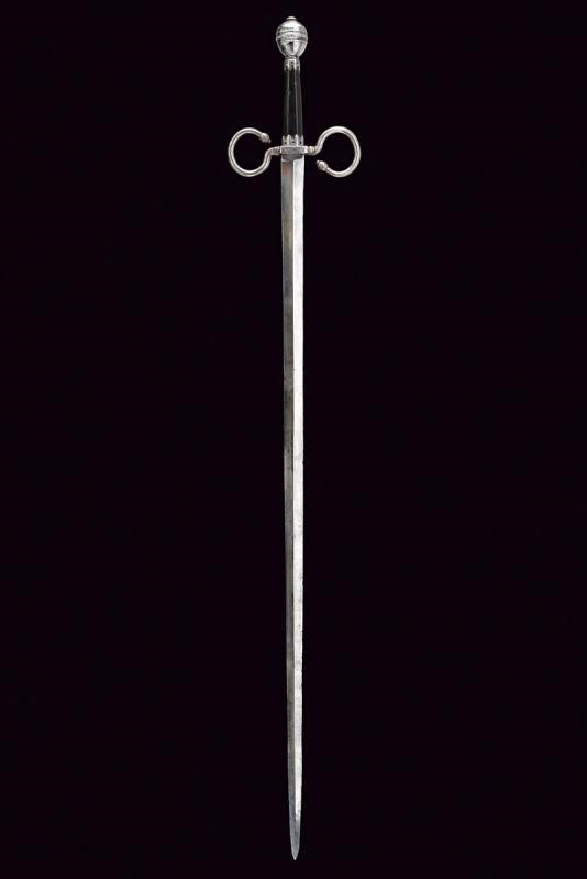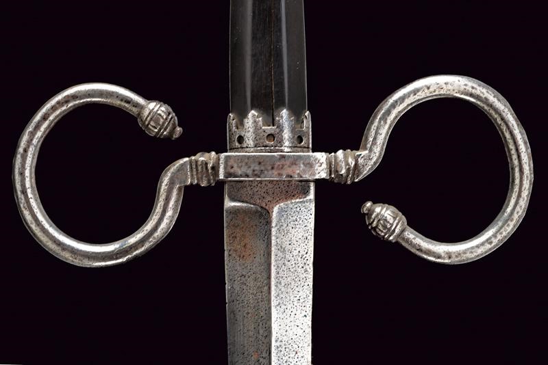 Lama dritta a due fili, costolata in mezzeria, dotata di tallone (XIX secolo). Bel fornimento in ferro con elso a bracci fortemente incurvati, quasi a formare cerchi, muniti di testa sferoide bottonata. Il pomo lavorato en suite. Impugnatura in ebano faccettato priva di trecciola, dotata alle estremità di ghiere traforate e con bordo festonato.