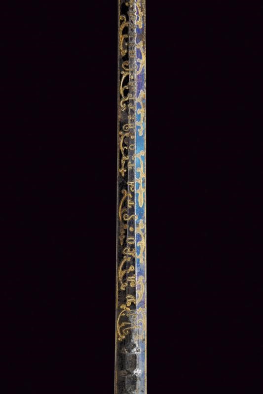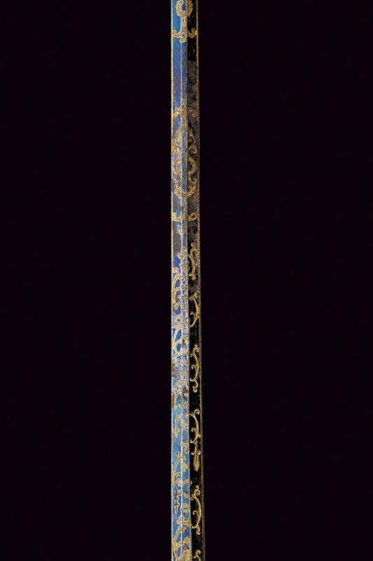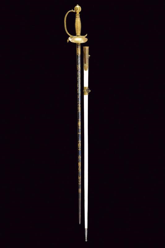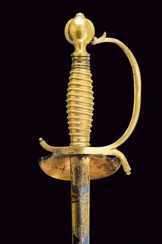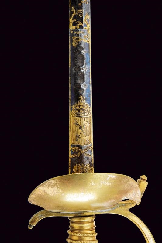 Bella lama dritta (settecentesca?) di sezione esagonale, brunita per quasi tutta la lunghezza e riccamente decorata con incisioni recanti resti di doratura. Sul lato di terza partendo dal tallone: emblema araldico a scudo stellato, scudo pontificio con chiavi decussate e triregno, il motto "Viva Lo Stato della Chiesa" fra volute, in seguito fregi floreali, un trofeo, raffigurazione di un personaggio che stringe una palma e una spada, infine un cartiglio con iscrizione "ALA / VORTONE" (?). Il lato di quarta decorato allo stesso modo sino al motto, poi con fregi floreali e trofei differenti rispetto all'altra faccia e con la raffigurazione di un angelo armato di spada. Alla punta le incisioni e la brunitura sono parzialmente svanite. Fornimento in ottone con resti di doratura. Semplice pelta liscia. Impugnatura in un unico pezzo, lavorata ad imitare la trecciola. Fodero in legno laccato bianco (la lacca più tarda?) con fornimenti in ottone, puntale in metallo color argento e cappa marcata "Labruna 1859 Napoli".