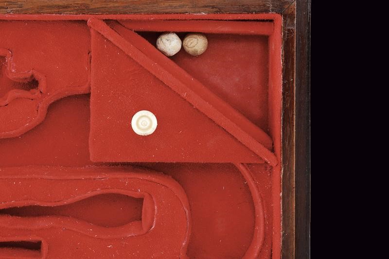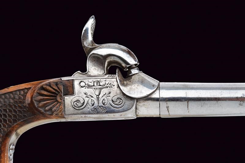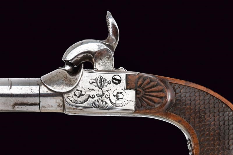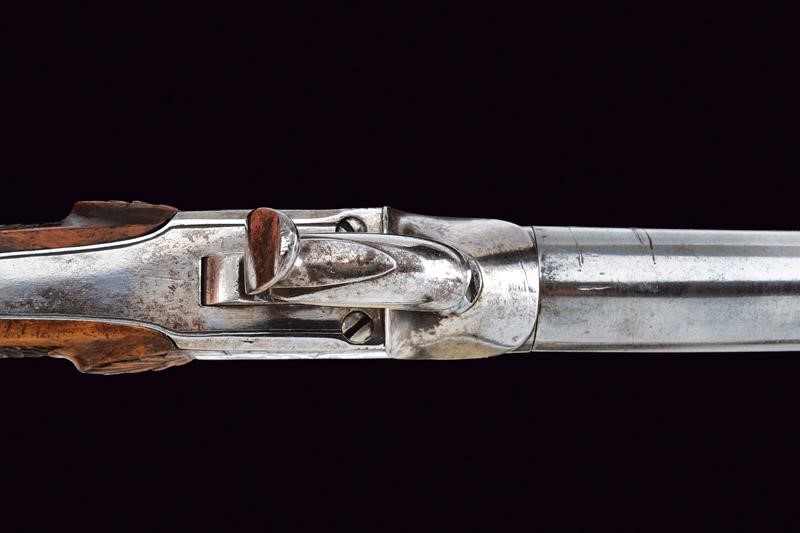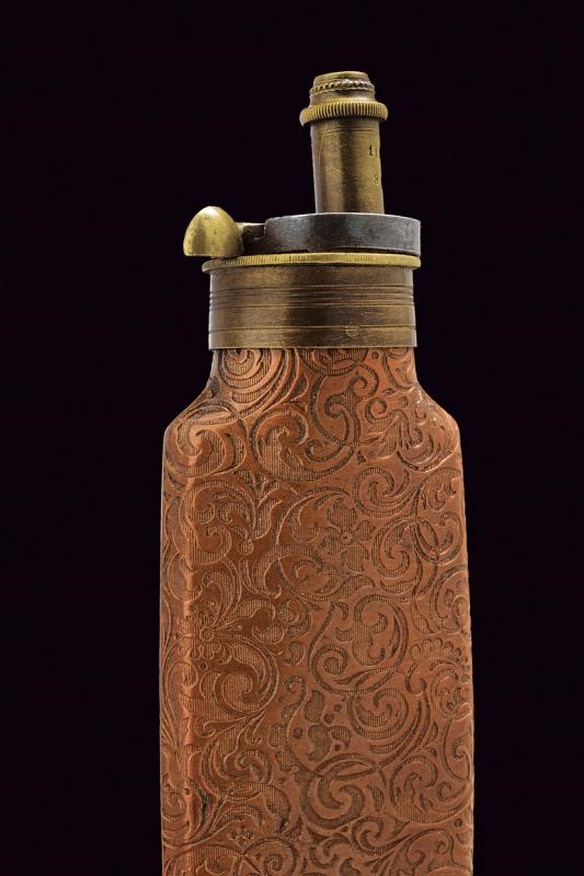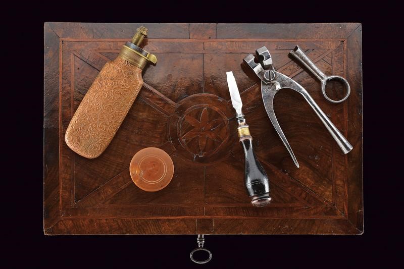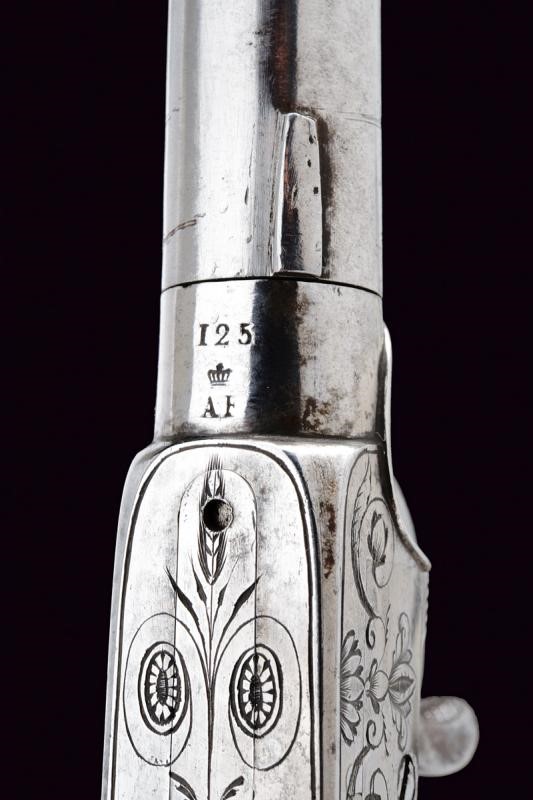 Canna tonda (piccoli danni), liscia, svitabile, con base marcata "125" e "AF" sotto corona, cal. 12 mm. Castello di tipo box-lock in ferro inciso a motivi floreali. Grilletto a scomparsa. Calcio in legno finemente lavorato a squame, la parte anteriore invece scolpita a fiore. In cassetta di legno rivestita internamente in velluto rosso e completa di tutti i suoi attrezzi e della fiasca da polvere. Chiave per la serratura presente.