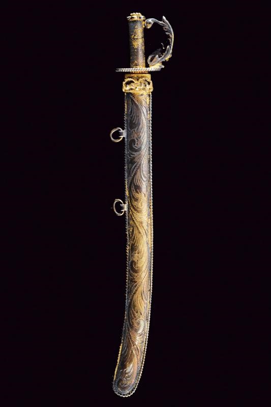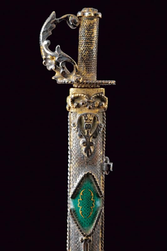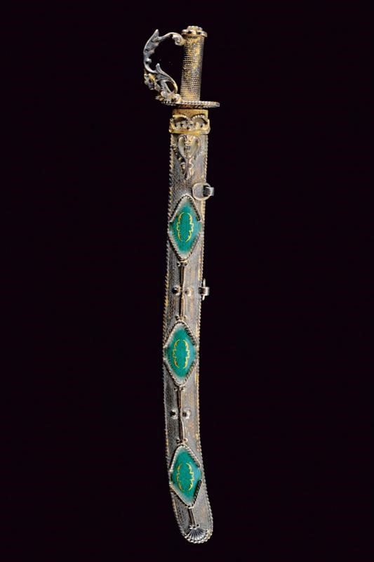 Finemente realizzata, con lama liscia. Fornimento e fodero entrambi in argento dorato, il secondo anche con tre placche smaltate e finemente incise a motivi floreali.