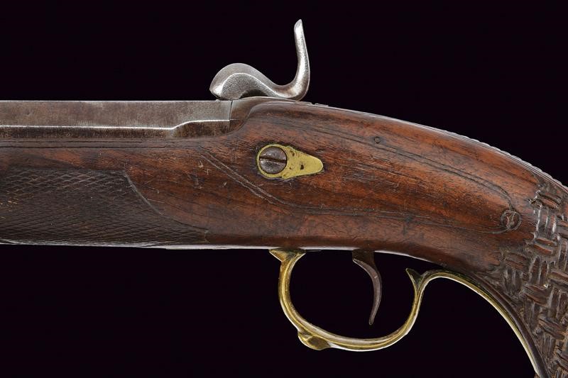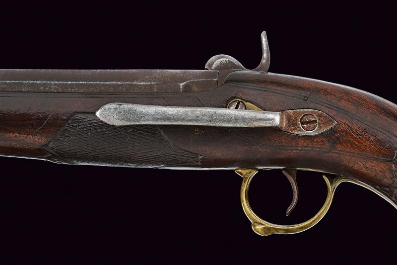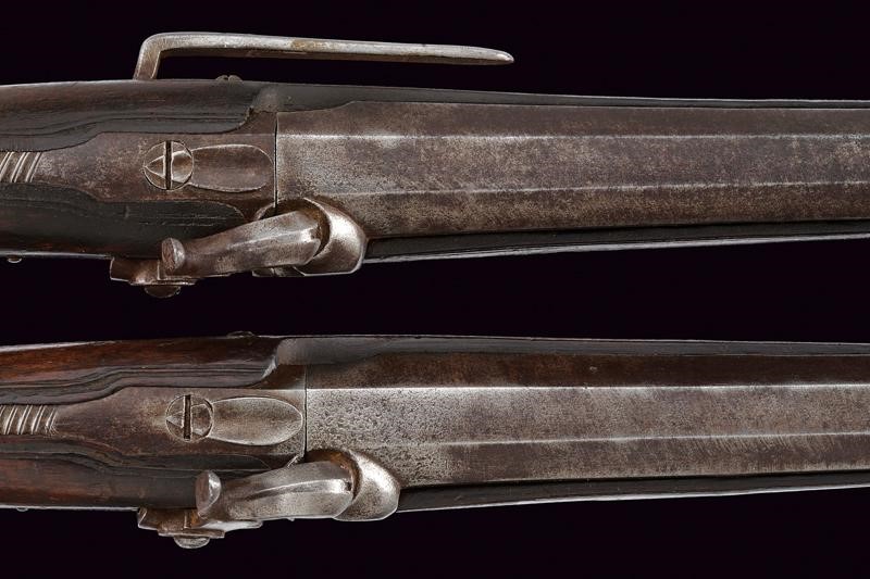 Canne lisce ottagonali decrescenti verso la volata, cal. 16.7 mm. Lunghissime ed inusuali codette lavorate a bande oblique, munite di traguardo. Batterie a molla indietro con cartella liscia. Casse in legno con calci scolpiti e astine zigrinate. Fornimenti in ottone, cocce con scomparto portacapsule. Bacchette in ferro. Una pistola con gancio da cintura.