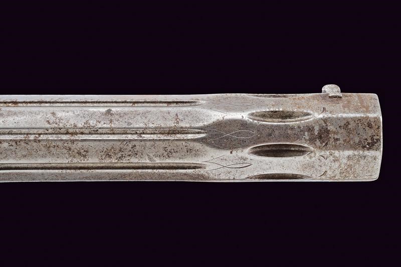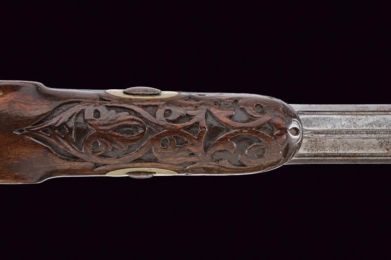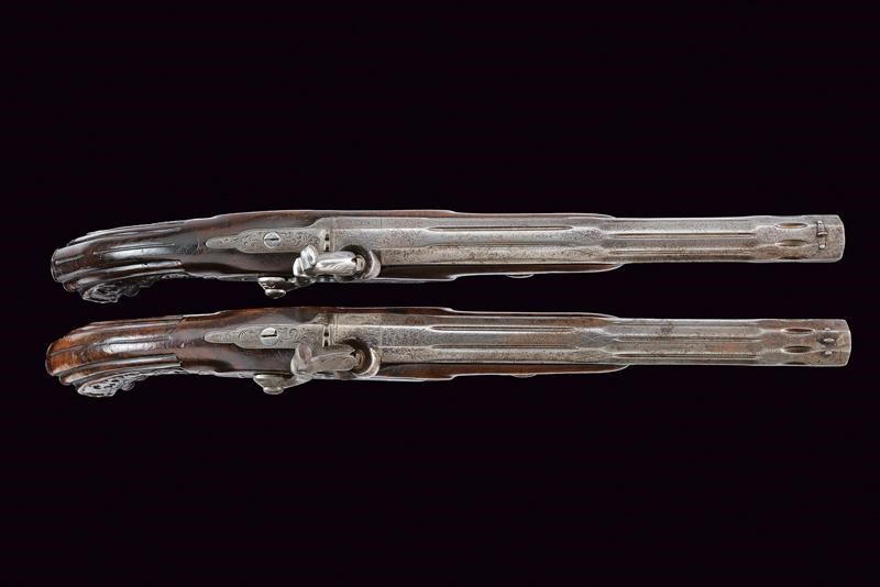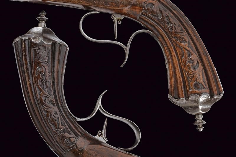 Canne ottagonali rigate (anima da pulire, rigatura visibile), strutturate a settori decorati a scanalature e incisioni, con resti di una firma, mirino di precisione, cal. 11.4 mm. Codette incise a motivi floreali e dotate di alzo. Batterie a luminello a molla in avanti, cartelle piatte ed ornate da incisioni a racemi, codoli ribassati. Mezze casse in legno con musi e calci scolpiti, i primi a motivi floreali e i secondi anche con scanalature. Fornimenti in ferro incisi en suite con le batterie, ponticelli con poggiadito, cocce prolungate con estremità a trottola. Grilletti con sensibilizzatore. Meccanica funzionate ma da rivedere.