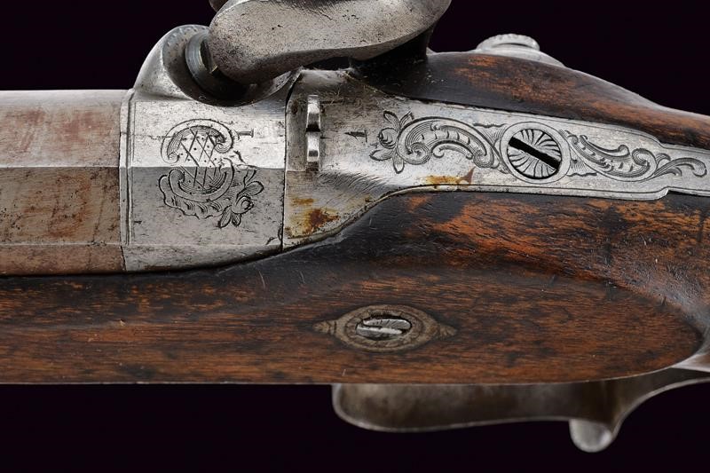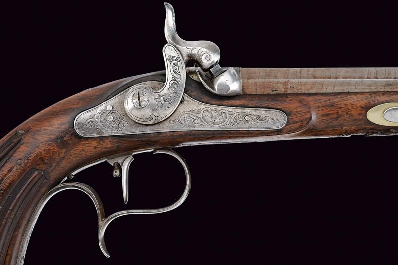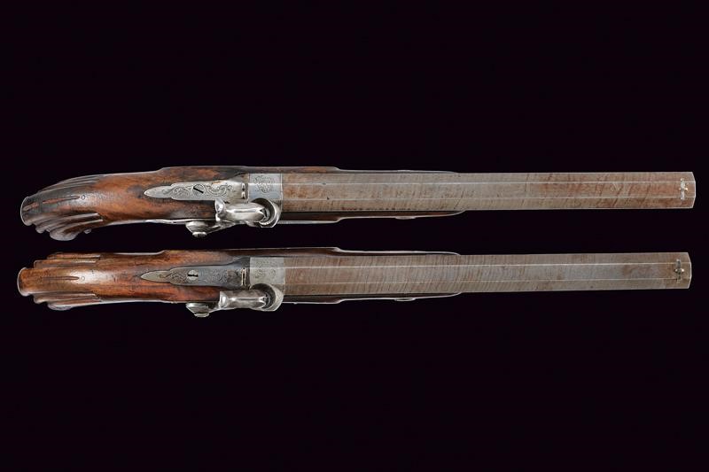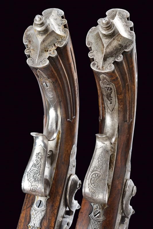 Canne rigate (anime pulite, rigatura visibile) ottagonali, con punzoni del banco di prova di Liegi, dotate di culatta incisa e mirino, cal. 12 mm; codette incise e munite di alzo. Batterie a molla in avanti incise a rocaille e a motivi floreali. Casse in legno con muso scolpito a motivi floreali in bassorilievo, i calci scanalati. Fornimenti in ferro decorati en suite. Ponticelli con poggiadito. Stecher. Coppia da cassetta quindi prive di alloggiamento per la bacchetta. Il fermo del cane di una pistola da rivedere.