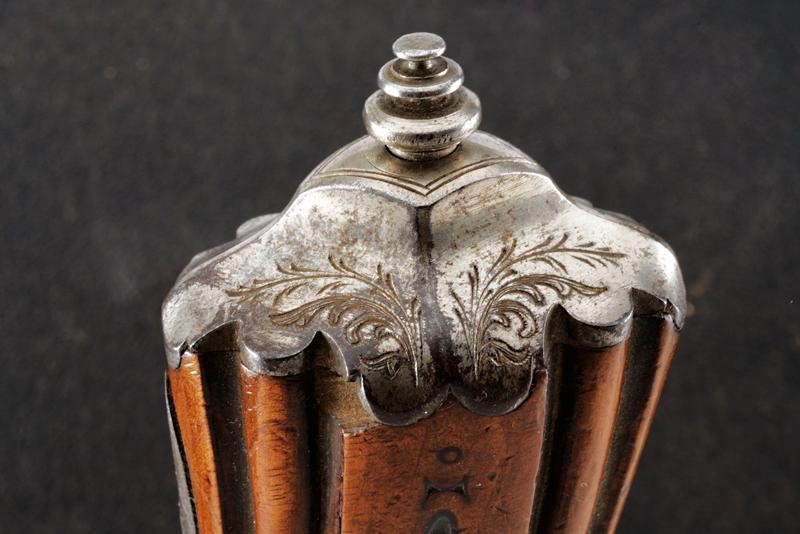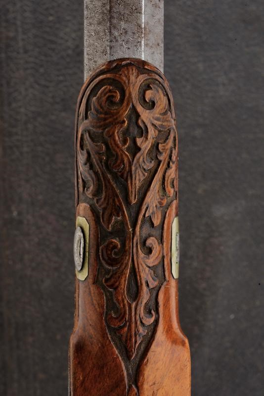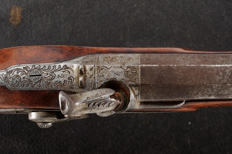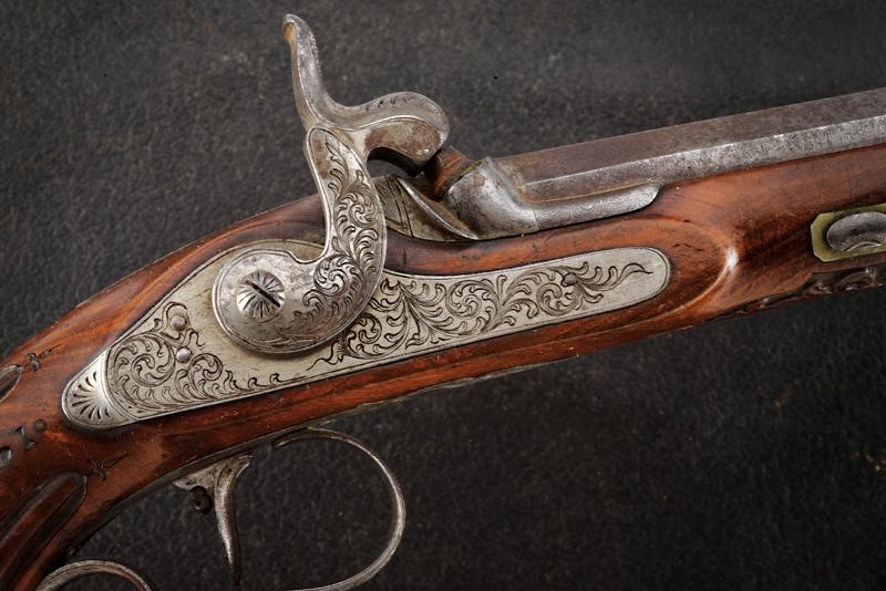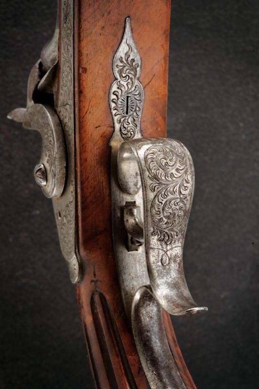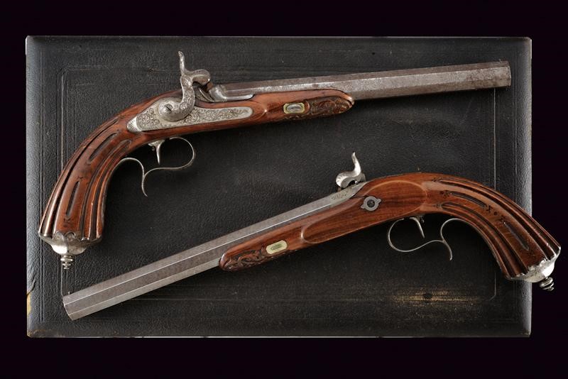 Canne rigate (anime con pitting, rigatura visibile) in fine damasco, incise a motivi floreali e numerate "1" e "2" alle culatte, recanti sul lato sinistro il punzone del banco di prova di Liegi, con mirino di precisione, cal. 11 mm; codette incise, numerate en suite e munite di traguardo. Batterie a molla in avanti finemente incise a motivi floreali. Casse in legno (una con qualche crepa) con muso scolpito a motivi floreali e con calcio scanalato. Fornimenti in ferro decorati nello stesso modo. Ponticelli con poggiadito. Stecher. Meccaniche funzionanti. In cassetta di legno (non pertinente ma antica) rivestito di cuoio e foderata all'interno di panno arancione, dotata di alcuni attrezzi.