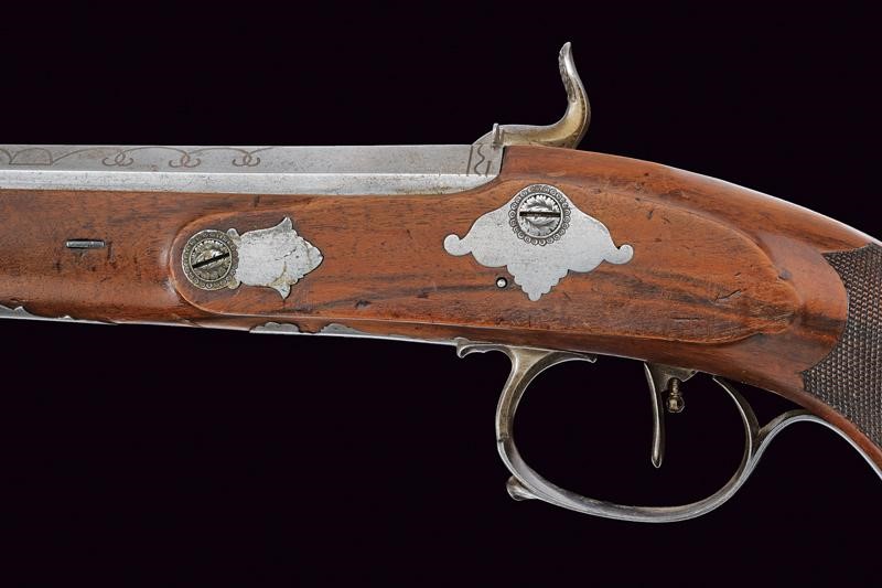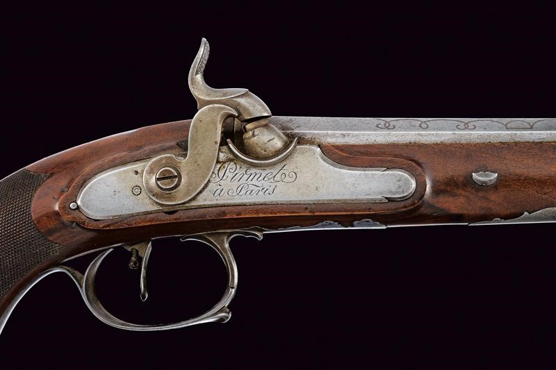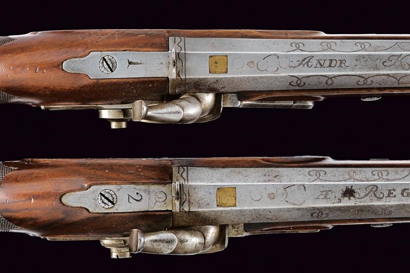 Canne di epoca anteriore, lisce, ottagonali, con mirino alla base, marchi rimessi in ottone (una mostra ancora il tipico cavallo della dinastia Kuchenreuther); su una canna firma in argento "ANDR. KUCHENREUTER" fra ghirlande, sull'altra "A. REGENSPURG" con la stessa decorazione; mirini in ottone, cal. 12 mm. Codette marcate "1" e "2". Batterie a molla in avanti firmate "Pirmet à Paris". Casse intere in legno con calcio zigrinato e coccia ottagonale, fornimenti lisci in ferro, i ponticelli con due fori (probabilmente per fissare un poggiadito). Grilletti con sensibilizzatore. Meccaniche funzionanti, un sensibilizzatore non tiene, da regolare. Bacchette in legno con battipalla in corno e cavastracci in ottone.
