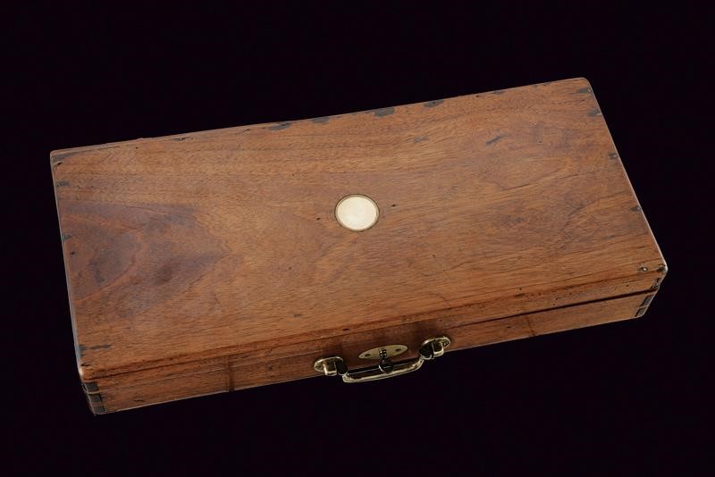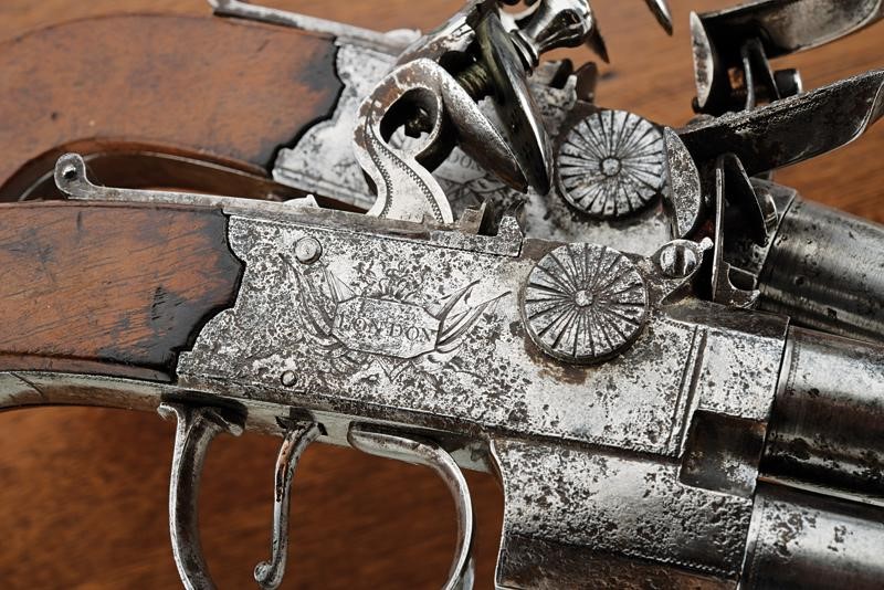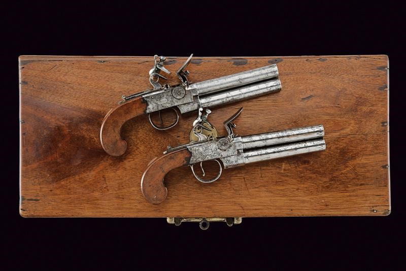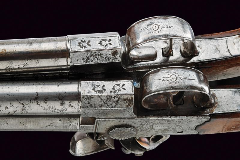 Canne rigate (anime pulite, rigatura ben visibile, una in condizioni migliori dell'altra), sovrapposte, tonde, incise alla volata, cal. 13 mm; castelli firmati "WHEELER" e "LONDON", incisi a trofei. Zone con danni da ruggine. Cani dorsali muniti di sicura. Sul lato sinistro selettore di canna. Calci in legno. In una cassetta di legno rifoderata internamente in velluto verde e munita di diversi attrezzi. Completa di chiave.
