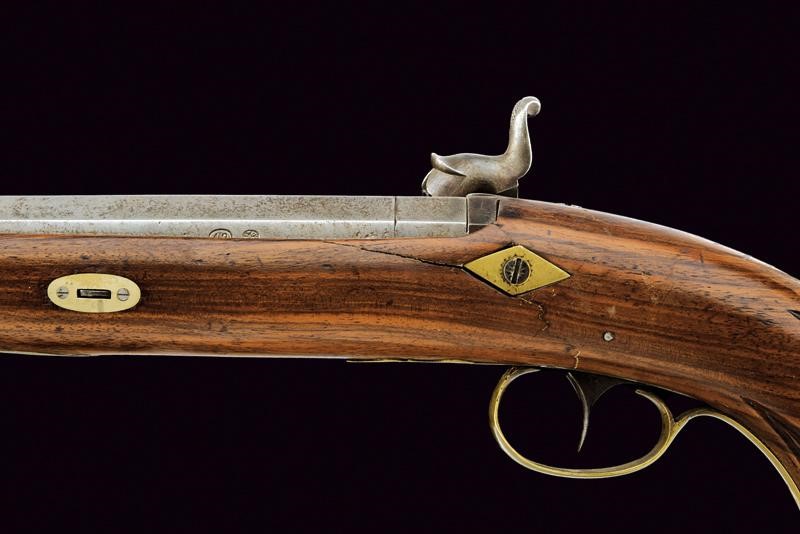 Canna liscia ottagonale con resti di punzoni sul fianco sinistro, mirino in ottone, cal. 16,8 mm. in volata. Codolo con piccolo traguardo a sella e incisioni a volute. Batteria a molla indietro. Meccanica funzionante. Cassa intera in legno (crepa sul lato inferiore e a sinistra). Impugnatura con scanalature. Fornimenti in ottone. Bacchetta in ferro.