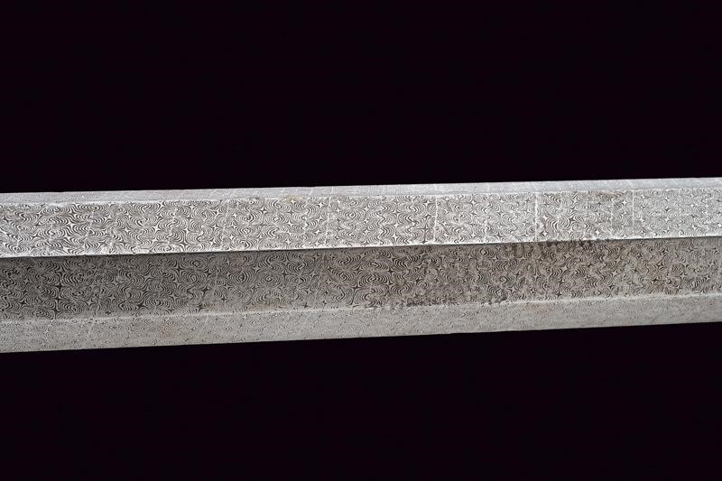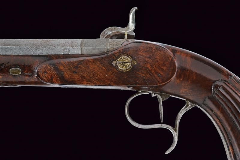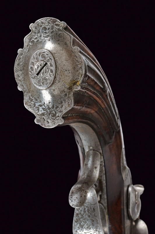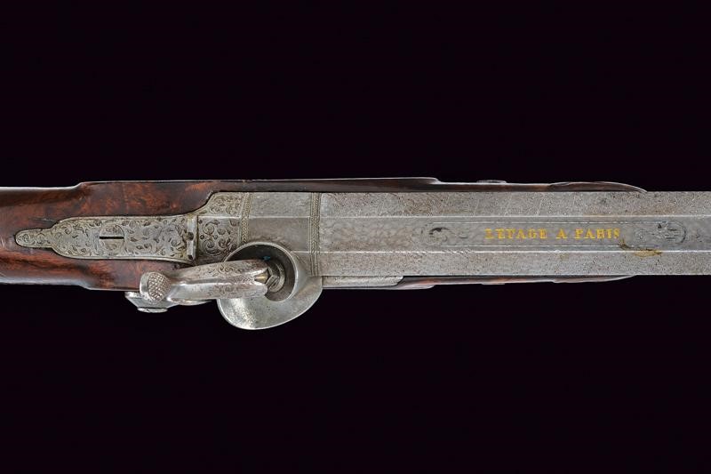 Bella canna rigata, ottagonale, in finissimo damasco, firmata "LEPAGE" in oro con cornice in argento, base incisa, mirino di precisione, cal. 12 mm; codetta incisa e dotata di alzo. Batteria a molla in avanti incisa a motivi floreali. Mezza cassa in legno con muso scolpito a fiorame, calcio scanalato, fornimenti in ferro decorati en suite. Grilletto con sensibilizzatore, ponticello con poggiadito.