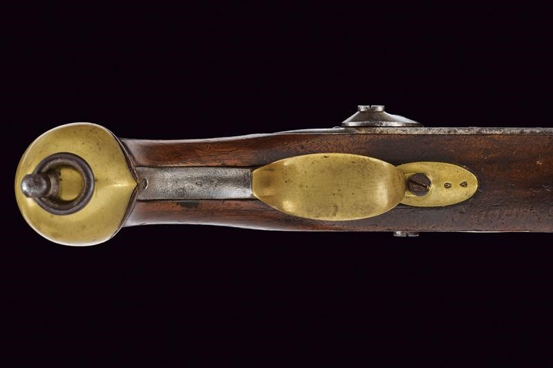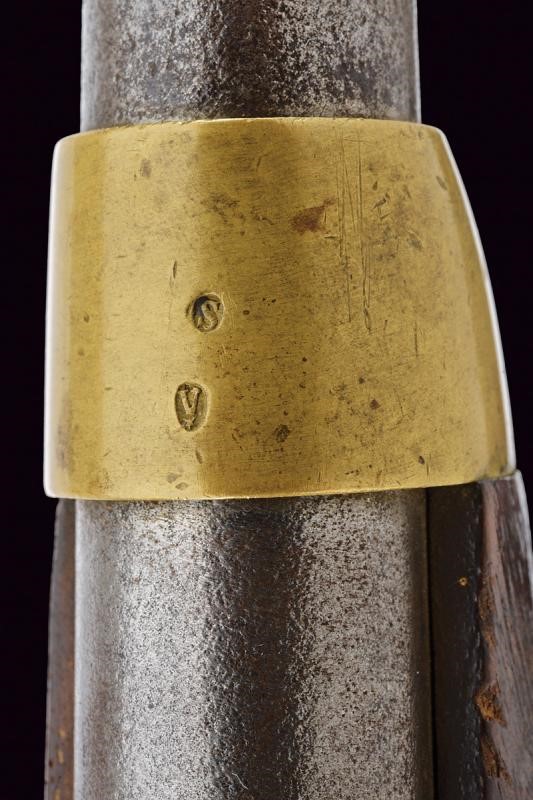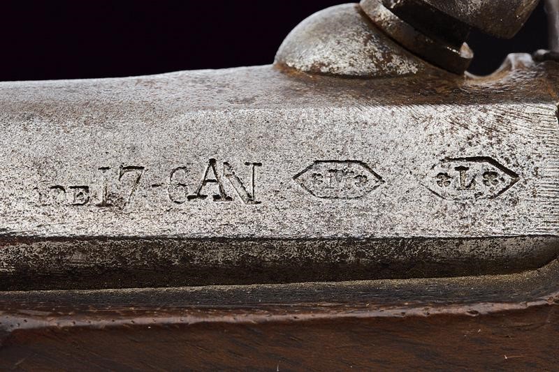 Canna tonda rigata, con culatta ottagonale marcata "DE 17 - 6AN", "M" e "L" entro ellissi, datata "G. 1836" sul lato destro e marcata "M I", dotata di mirino, cal. 17,5 mm. Il codolo con tacca di mira e marcatura del modello "M.le 1822 T Bis". Batteria marcata "M.re Imp.le de Chatellerault" e con punzone "P" entro scudetto. Meccanica funzionante. Cassa a tre quarti in legno con qualche segno d'uso, sul fianco sinistro bollo "MI", timbro "St. ETIENNE" e "D" sotto corona. Fornimenti in ottone con vari punzoni. Bacchetta in ferro. Anello di sospensione.