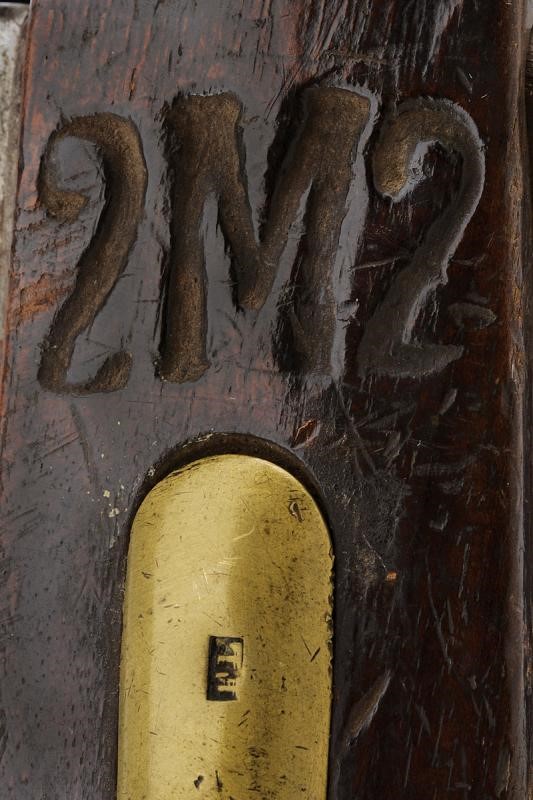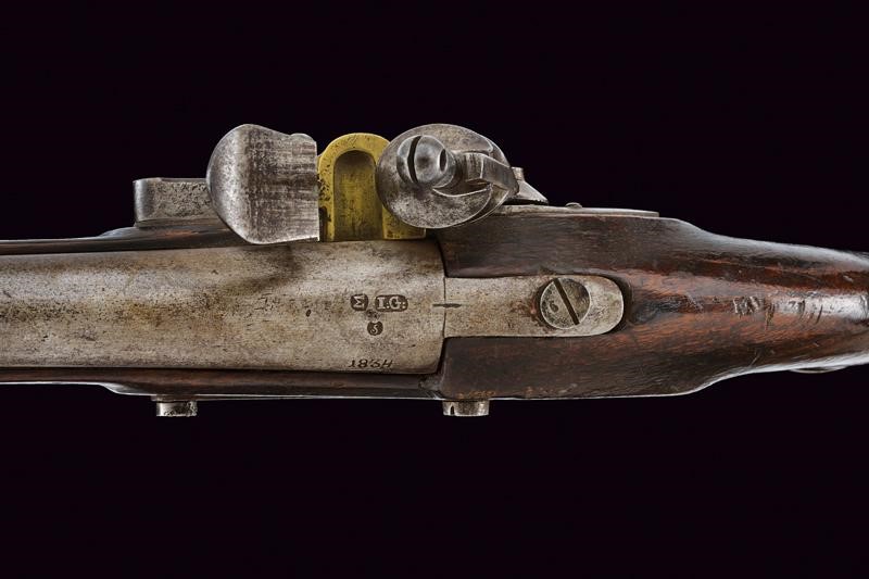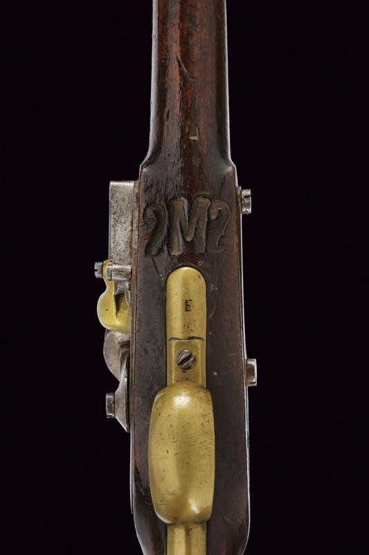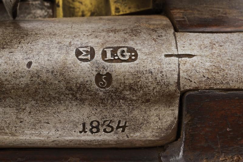 Canna liscia tonda, con base quadra, marcata e datata "I.G:", "M" e "1834", cal. 17 mm. Batteria a pietra focaia con firma della manifattura di Brescia e con scodellino in ottone. Cassa intera in legno marcata sotto alla batteria "2M2" e con fornimenti in ottone, la contropiastra in ferro. Piccoli difetti.