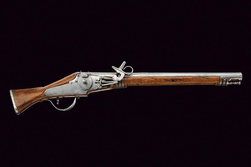 Lunga canna liscia a due ordini, prima ottagonale con punzone "G" alla base, poi tonda, con anellatura al cambio, cal. 13 mm. Codetta liscia angolata. Batteria a ruota esterna e cartella piatta, il cane dotato di anello, scodellino con copriscodellino scorrevole. Cassa intera in legno di noce (piccole mancanze) decorata con tarsie floreali in filigrana. Fornimenti in ferro, il ponticello costolato. Bacchetta in legno con battipalla in ferro intagliato e traforato.