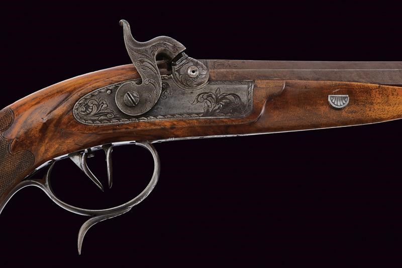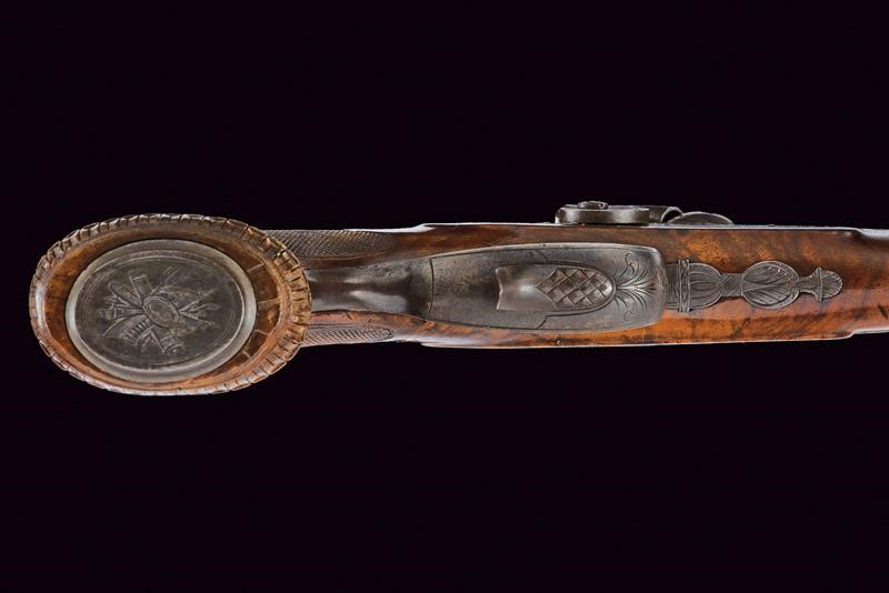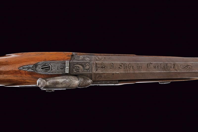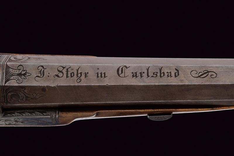 Canna ottagonale con lieve microrigatura, recante resti di brunitura probabilmente antica, firmata al dorso "J. STÖHR IN CARLSBAD", incisa alla base a fiorami e con cornicetta in volata, dotata di mirino, cal. 11,2 mm. in volata. Culatta incisa a rocaille. Codolo numerato "2" e munito di alzo fisso. Batteria a molla in avanti con cornicetta incisa sulla piastra e fiorami, presenti anche al collo del cane. La testa del cane incisa con volto grottesco. Cassa a tre quarti in legno con collo zigrinato. Il muso con intaglio a palmetta e riccio. Fornimenti in ferro. Bella contropiastra sagomata e incisa a effigiare un drago. Coccia piana ellittica (leggermente lasca) recante trofeo inciso. Ponticello con poggiadito e incisioni floreali. Grilletto e stecher ben funzionanti. Vite di regolazione.