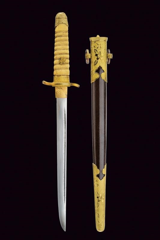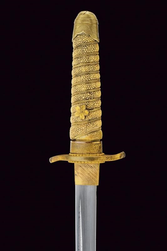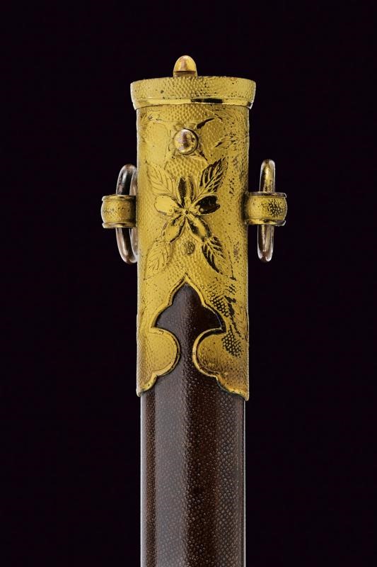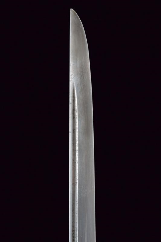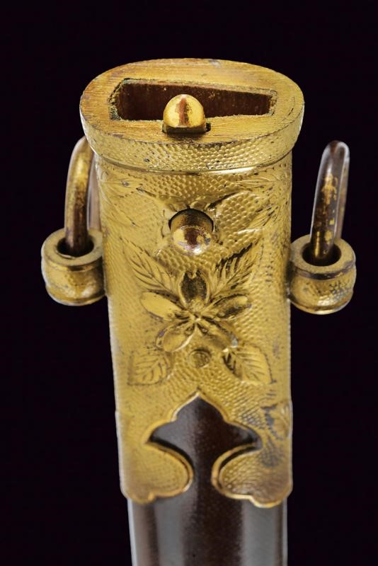 Lama Hira-zukuri con Hi, hamon parzialmente visibile, hada non visibile, qualche lieve intaccatura. Nakago mumei con un Mekugi-ana. Habaki in rame dorato. Fornimento militare in ottone con resti di doratura. Elso punzonato "SA". Mekugi in due elementi in metallo dorato con testa effigiante fiore di ciliegio. Impugnatrua in materiale ad imitare la pelle di razza. Avvolgimento di trecciola dorata in ottone. Saya in legno con rivestimento color bruno, i fornimenti con fiori di ciliegio in rilievo. Due campanelle. Pulsante di sblocco sulla cappa.