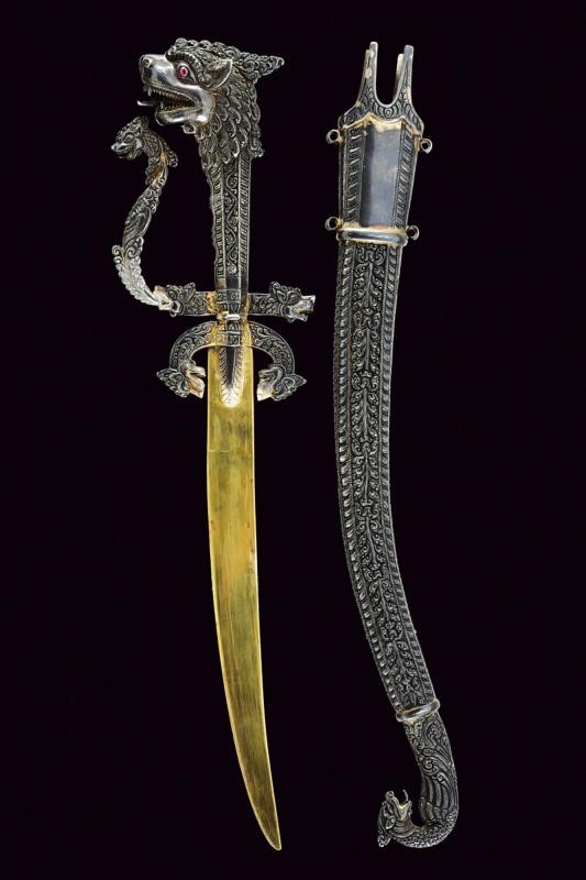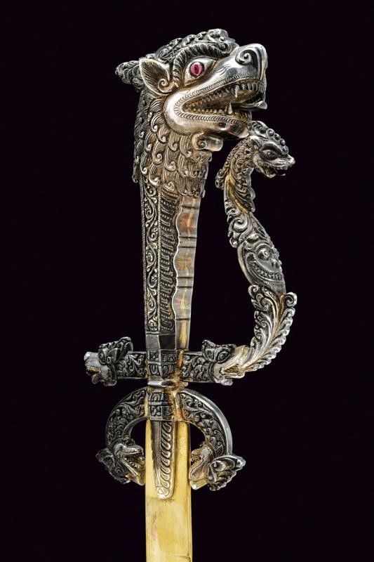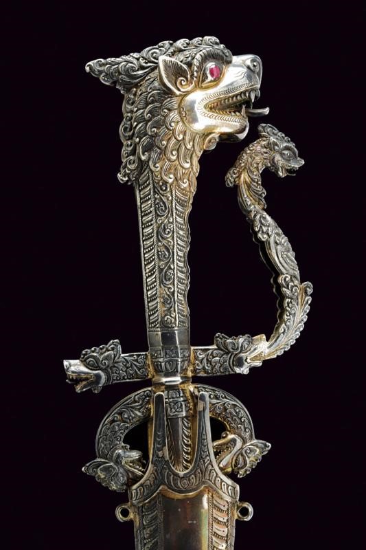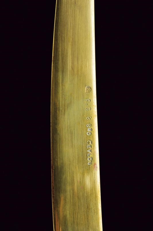 Lama a un filo in metallo non ferroso, probabilmente in argento dorato, recante marcatura "P.S & BRO CEYLON" preceduta da un punzone (a semicerchio con effige di un animale, probabilmente il leone emblema nazionale, all'interno). Fornimento in argento massiccio. Alette fermafodero intagliate a palmette, archetti culminanti in teste di drago (Makara?) con collo ornato a motivi floreali. Il breve braccio di parata lavorato en suite con gli archetti; il braccio di guardia è inizialmente identico a quello di parata, ma dalle fauci del drago fuoriesce il ramo di guardia, questo è controcurvato, riccamente intagliato e culminante in un'altra testa di drago, a fauci spalancate e con la lingua che fuoriesce. L'impugnatura di forma rastremata verso il basso, lavorata a motivi floreali e culminante in un grande pomo, sempre a testa di drago con occhi in pietra rossa; le fauci spalancate, con denti aguzzi, dalle quali fuoriesce la lingua. Il fodero sempre in argento lavorato in bassorilievo en suite, a motivi floreali molto ben realizzati, come anche il puntale, finemente lavorato a testa di Makara. L'argento lievemente brunito e un lieve bozzo al fodero. La guaina interna del fodero in legno. Quattro passanti di sospensione.