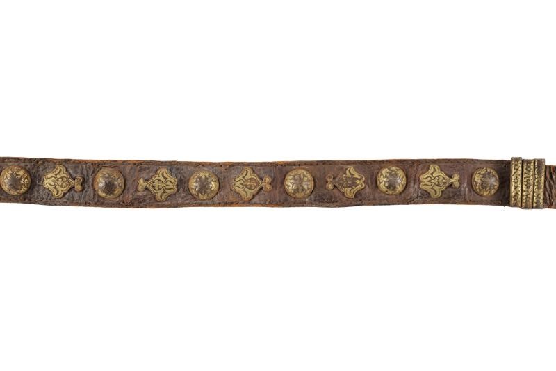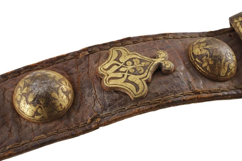In cuoio (segni d'uso e del tempo) con fornimenti in ferro decorati a motivi i floreali in oro (mancanze). Completa di fibbia e passanti.