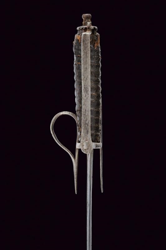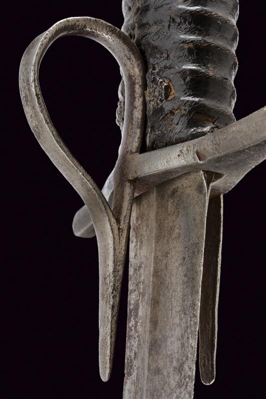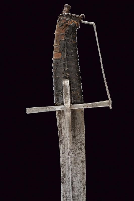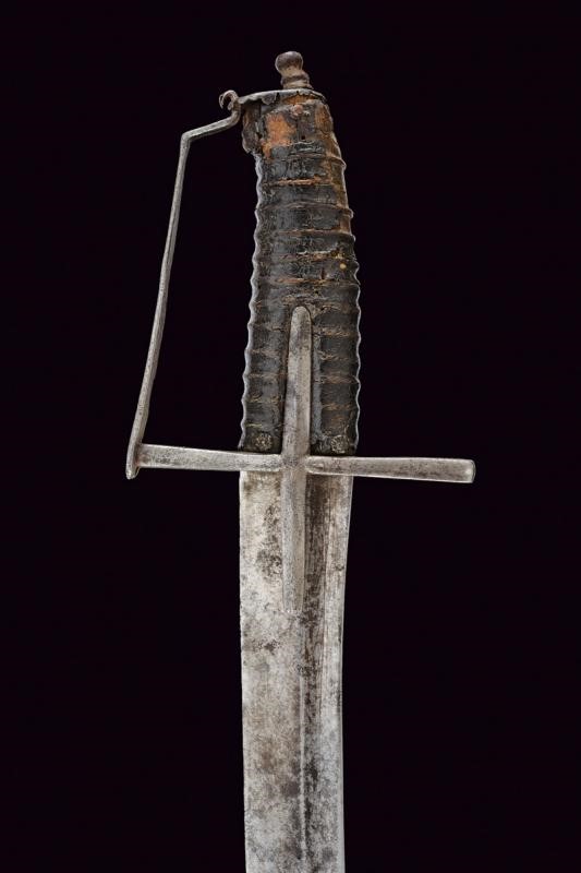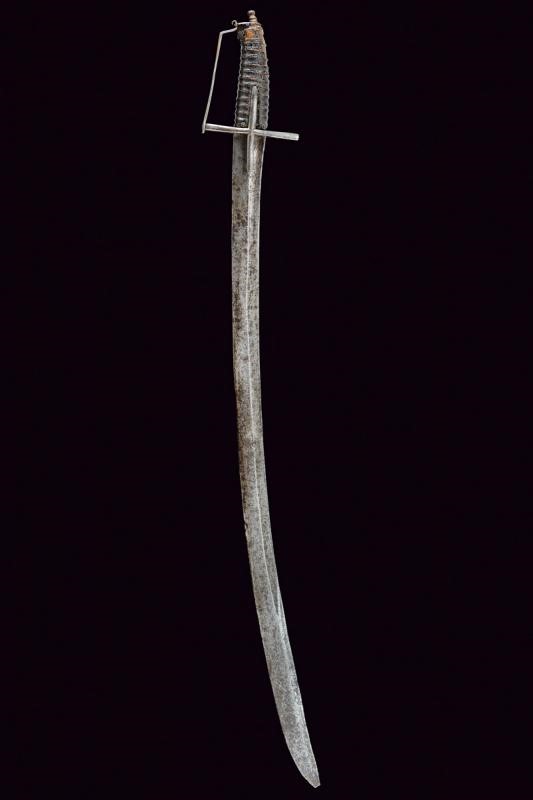Lama di media larghezza, curva, a un filo e controfilo con sguscio sotto al dorso. Fornimento in ferro con elso munito di anello e alette fermafodero, ramo di guardia obliquo. Impugnatura in legno rivestita di cuoio (mancanze), decorato con piccoli rivetti a fiore, la cappa in ferro con grande bottone. Polacca o ungherese.