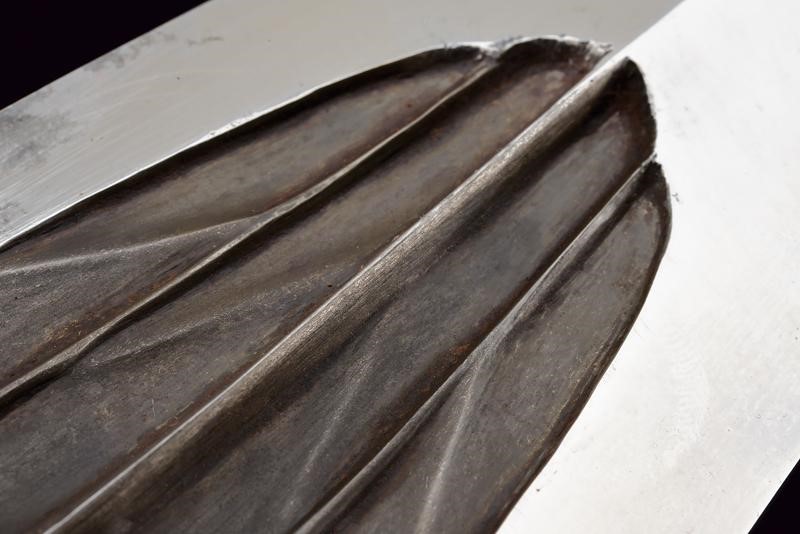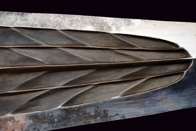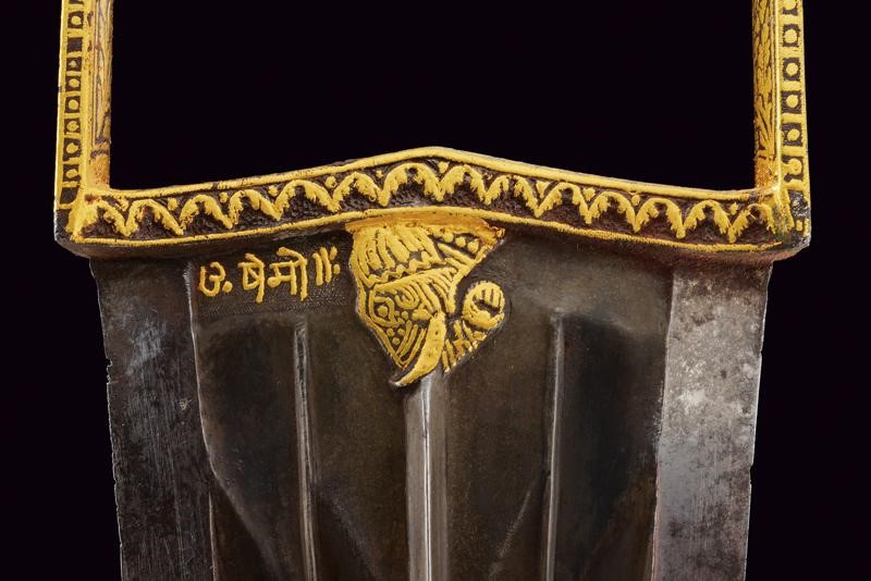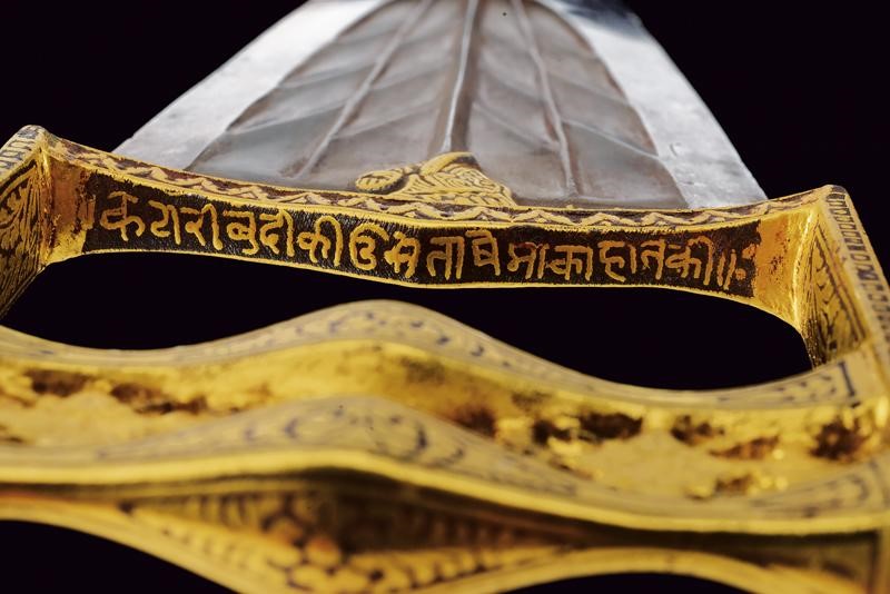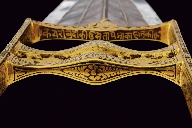 Bellissima lama a due fili con quattro scanalature, e nervature a forma di freccia; la punta ingrossata e costolata in mezzeria, la base intagliata al centro a testa di elefante tra iscrizioni rimesse in oro su entrambi i lati. Fornimento di tipica foggia; i due traversini dell'impugnatura uniti da una decorazione floreale traforata. Tutta la superficie del fornimento decorata in oro a motivi floreali e geometrici. La base dell'impugnatura con altre iscrizioni in oro. Piccolissime mancanze alla doratura. Fodero originale in legno rivestito di velluto bordeaux (completamente liso e con piccole mancanze di materiale), con resti di una taschetta e di una piccola guaina per inserire un coltellino ed altri strumenti. Puntale in bronzo dorato, inciso e traforato.