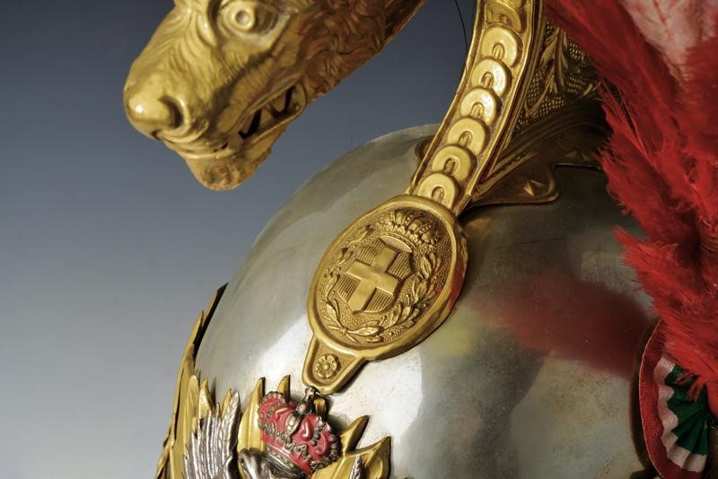 Coppo in alpacca con fornimenti dorati, cimiero in ottone con bella doratura, ceffo a testa di leone con coda in crine nero, oliva con scudo sabaudo coronato, raggiera sormontata da aquila con corona argentata, caricata sul petto dal monogramma VE III (Vittorio Emanuele III 1900-1946). Tipico soggolo a squame con orecchioni tondi con stella, coccarda tricolore in cotone e pennacchio originale rosso-bianco. Interno con visiere rivestite di marocchino rosso, alluda in pelle chiara lavorata a spicchi.