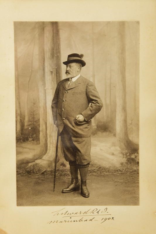 Foto de Re in abiti civili, scattata in un bosco, firmata "Edward Marienbad - 1908". In cornice lignea con monogramma del Re in metallo, completa del vetro.