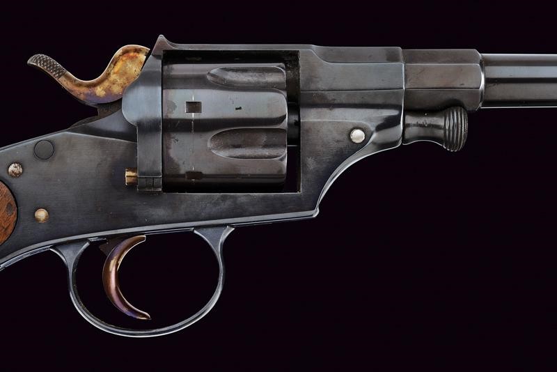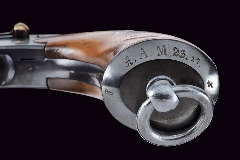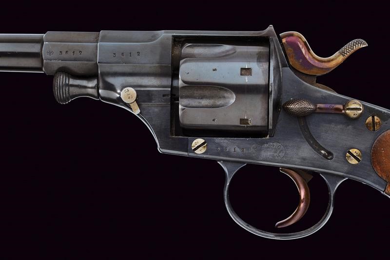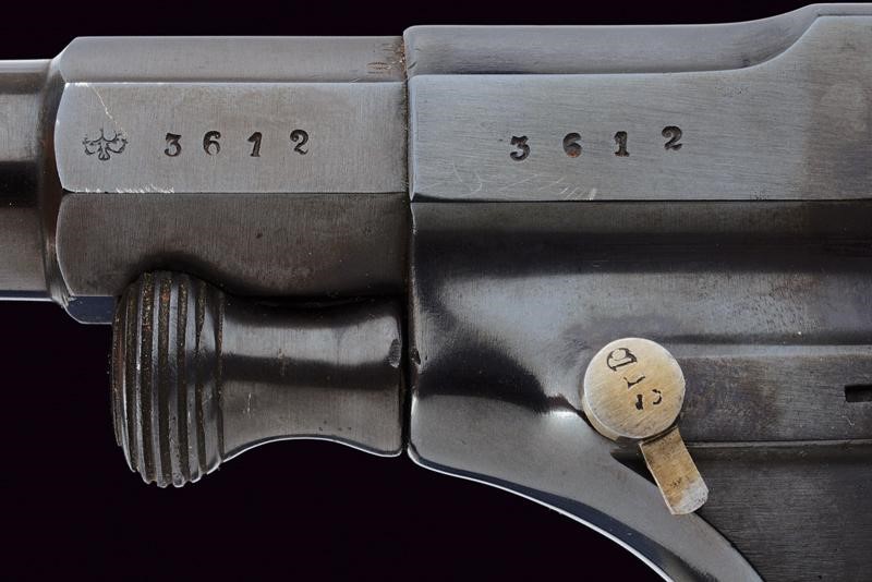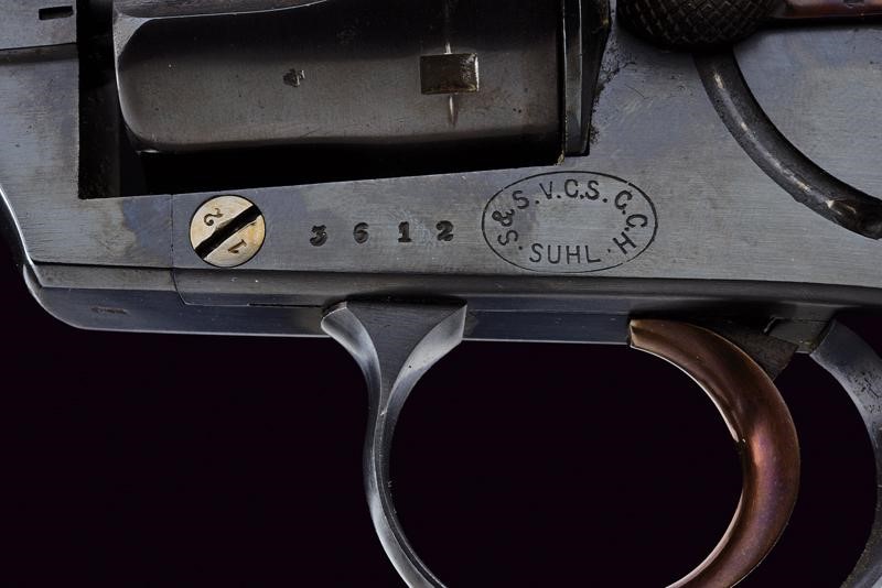 Canna tonda rigata (anima da pulire, rigatura visibile) con base ottagonale, dotata di mirino, recante marcatura "10,55" (calibro). Tamburo scanalato a sei colpi. Castello con sicura, marcatura "S. & S. V.C.S. C.C.H SUHL". Guancette lisce in legno, anello porta correggiolo. Meccanica ben funzionante. Vari punzoni nella parte inferiore, la coccia con marcatura "r.A.M.23.17". La brunitura forse più tarda. Matricola "36xx" coeva su canna, castello e tamburo.