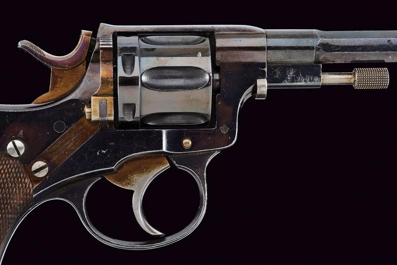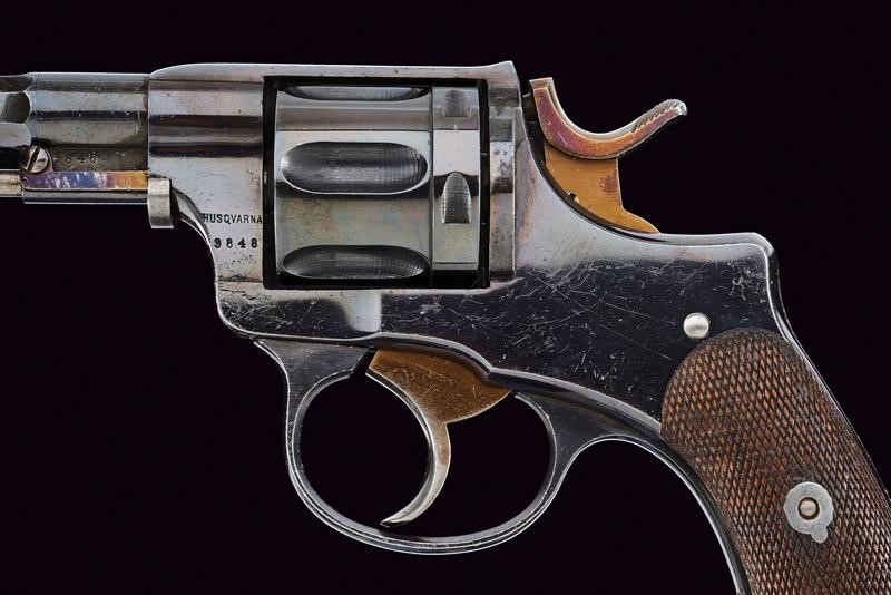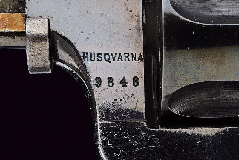 Canna ottagonale rigata (anima pulita, rigatura visibile) con base tonda, cal. 7,5 mm. Tamburo sgusciato a sei colpi. Meccanica ben funzionante. Castello con marcatura "HUSQVARNA" e punzone a corona. Guancette in legno zigrinato. Anello porta correggiolo.