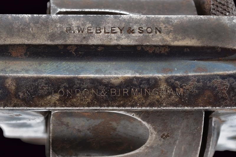 Canna rigata, tonda con bindella, mirino in argento, cal. 450. Tamburo scanalato a sei colpi con punzoni del banco di prova. Castello marcato "W&S", "WEBLY'S" e con marchi. La cornice superiore "P. WEBLEY & SON" e "LONDON & BIRMINGHAM". Brunitura al 80 %. Calcio in legno zigrinato. Anello di sospensione. Fabbricato da Webley per Weeks & Son.