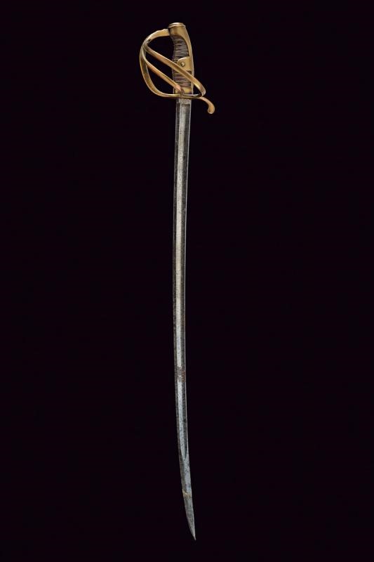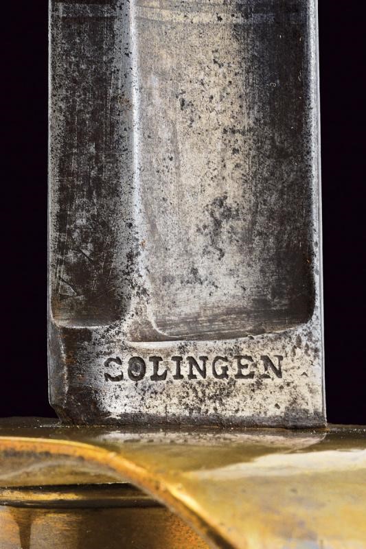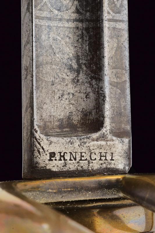Lama curva a un filo e breve controfilo, sgusciata per buona parte della lunghezza, recante al forte resti di incisioni a trofei e fiorami, marcata al tallone "P. KNECHT / SOLINGEN". Fornimento in ottone a tre rami di guardia. Impugnatura con cappetta lunga. Rivestimento in pelle con resti di trecciola in ottone. Priva di fodero.