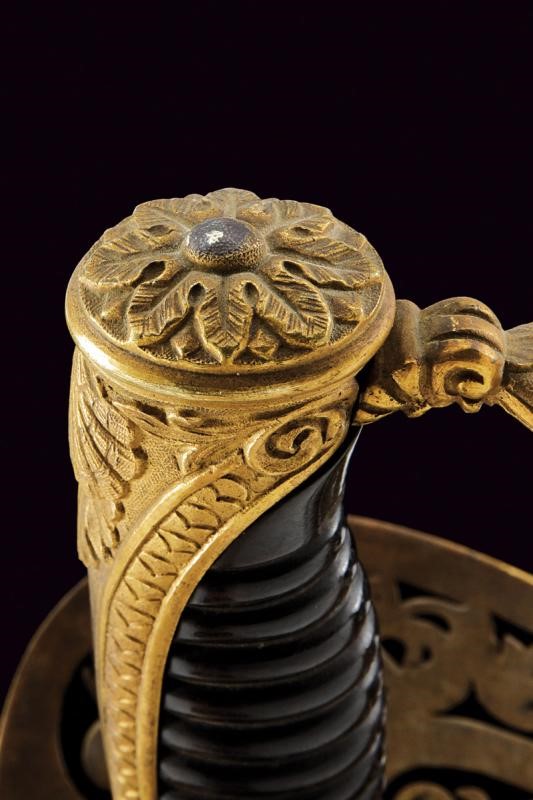 Lama leggermente curva con dorso a bacchetta e jelman (piccole aree con pitting). Bel fornimento in ottone dorato con trafori a racemi e àncora coronata, guardia intagliata con ricciolo, impugnatura in corno bruno a spire, cappetta in ottone dorato con piccoli intagli a squame e conchiglia. Fodero in cuoio nero con bei fornimenti dorati, ancora coronata e conchiglia a rilievo sopra il puntale.
