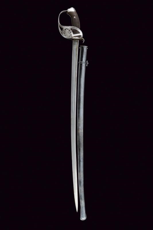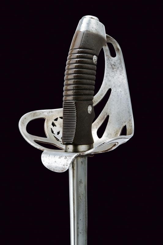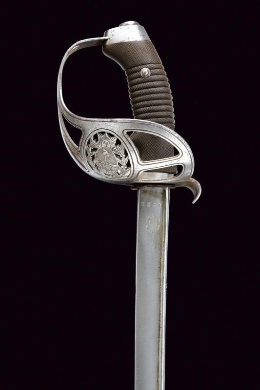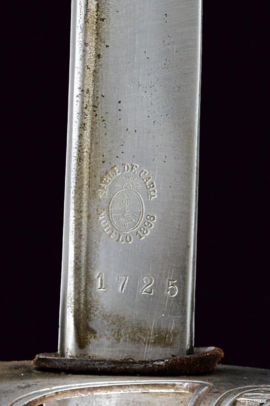 Lama curva a un filo, con jelman, base marcata "WEYERSBERG, KIRSCHBAUM & C.o SOLINGEN" su un lato e "SABLE DE CAB.IA MODELO 1898" con marca e numero. Fornimento in ferro traforato con stemma dell'Argentina sormontato dal sole e posto tra frode di lauro. Impugnatura in bachelite micro-zigrinata. Completa di fodero brunito munito di una campanella e numerato en suite come lama e fornimento.